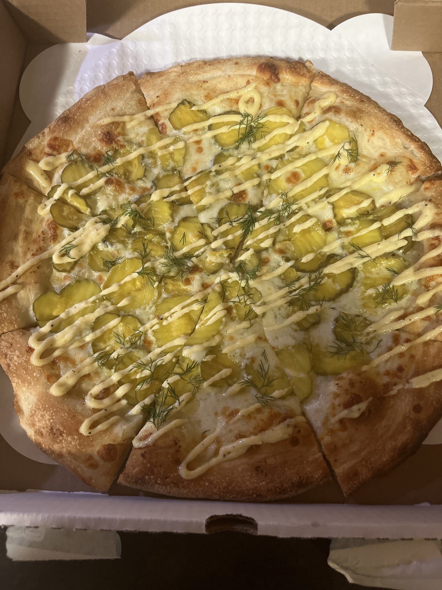 First time customer might come back only because they are the only ones who have pickle pizza! But got my order and the pizza was so cold I have to wait even longer to eat because I had to heat it back up! Along with the garlic bread knots mind you they are a giant piece of bread and it’s so dry you can’t hardly chew it! I will be calling the manager to complain and to get a partial refund as not only was the food cold and not the best they are out of pretty much EVERYTHING that might be worth eating. So as a first time customer it might be a last time deal too. Hopefully someone else with better abilities will make the pickle pizza.