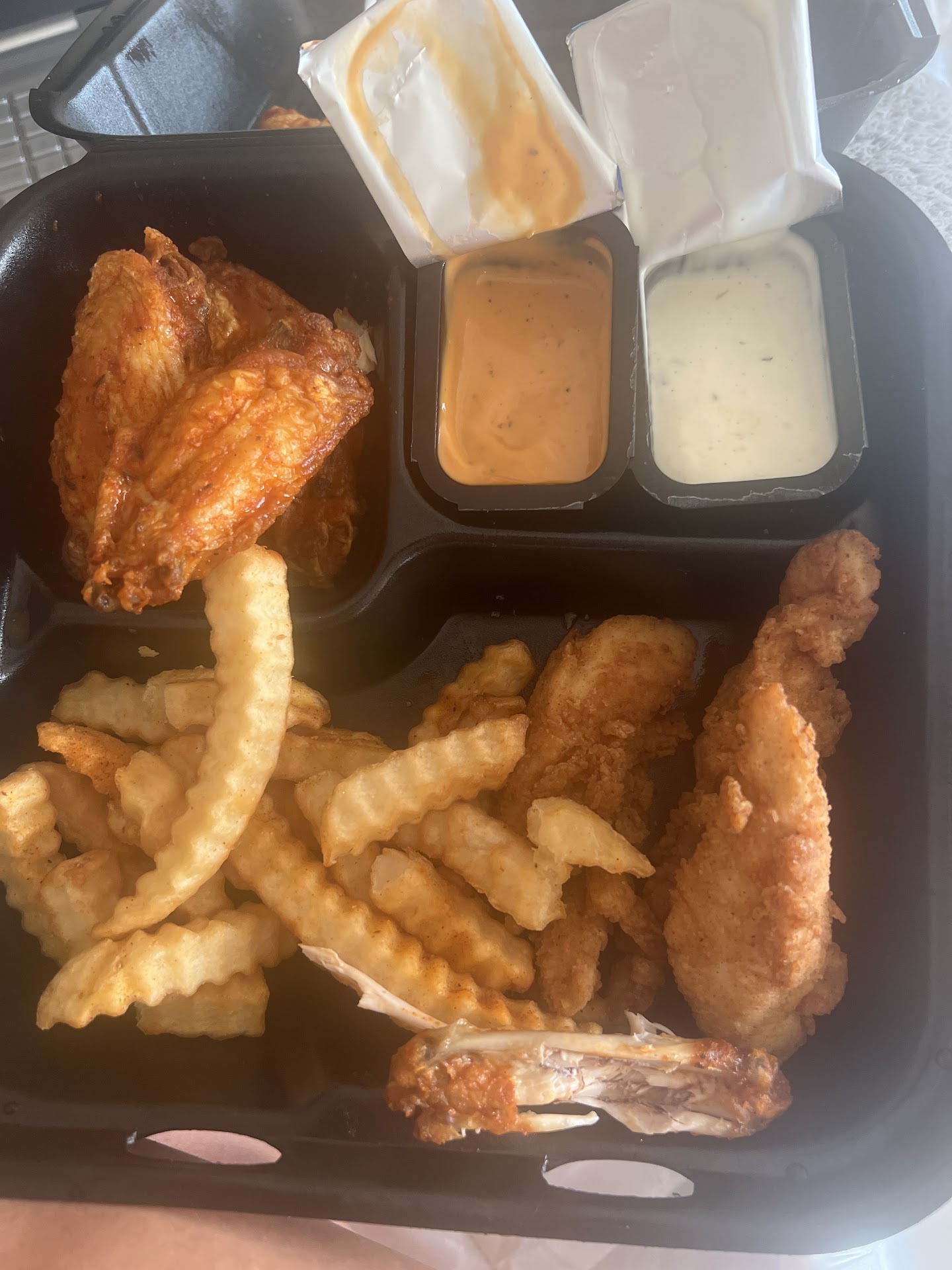 It was our first experience in the store and we enjoyed it as we walked in. We ordered and sat down. The food took about 10 minutes to arrive and they weren’t busy, which isn’t terrible and I can’t complain too much as they seemed to be working hard on something in the back. When we got our food we noticed that my girlfriend didn’t get her toast, so before I went to ask for it the manager approached our table and offered extra wings, apparently someone didn’t want them and she was offering it to us. We politely declined and asked for our toast, which we received. Upon further inspection the wings we got were cold at the bone, the meat was warm at the top at best. One of our ranch cups was already open when we got it as well. And after this a lady was going around for a fundraiser, apparently if you dropped your receipt in a box at the register you would donate some of your total. Well she was going around to people already eating and asking them to get up and put their receipts in that box, we thought that was a little strange.