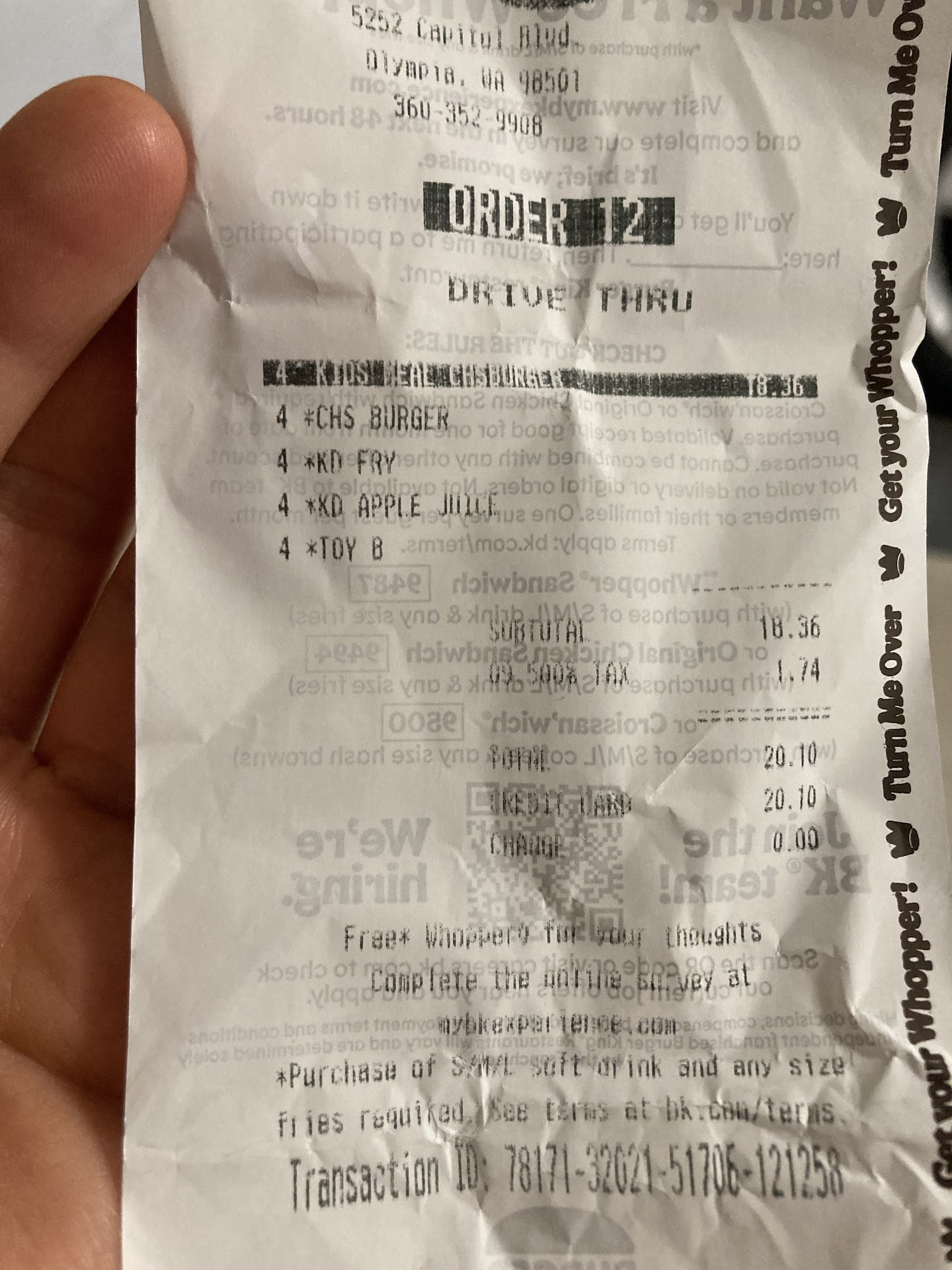 With the end of the pandemic, one would think folks would be settling down. Not so at this Burger King. Here's what happened tonight around 5 pm. My buddy and I stopped by before going shopping at Walmart in Tumwater. We do this often. While service has NEVER been stellar, it was down right insulting tonight. The car before us apparently put in a $108.00 order. I did not see that much food handed to the customer. But what it did was make us wait a long time. When we first pulled up we were told they would be right with us. A full 5 minutes later, we started asking if they were going to take our order. The voice said harshly to give them a second. My buddy said that it's been over 5 minutes. A different voice came on yelling at us to never cuss at his employee. We're both practicing Christians. We do NOT cuss at people! When my buddy explained that he had not cussed, the voice said to pull up so they could take our order. By this time, we had NO desire to eat there. When we got to the window, I asked for the owners name and number. They would not give it to me. Instead giving me a receipt with the local number on it. Then he told us to get the F#%@ off his property and never come back! He cussed at us several more times when he noticed I was recording his tirade. This Burger King will never get another penny of our money. The lack of training is transparent. The owners should be ashamed! Poor, poor service tonight....