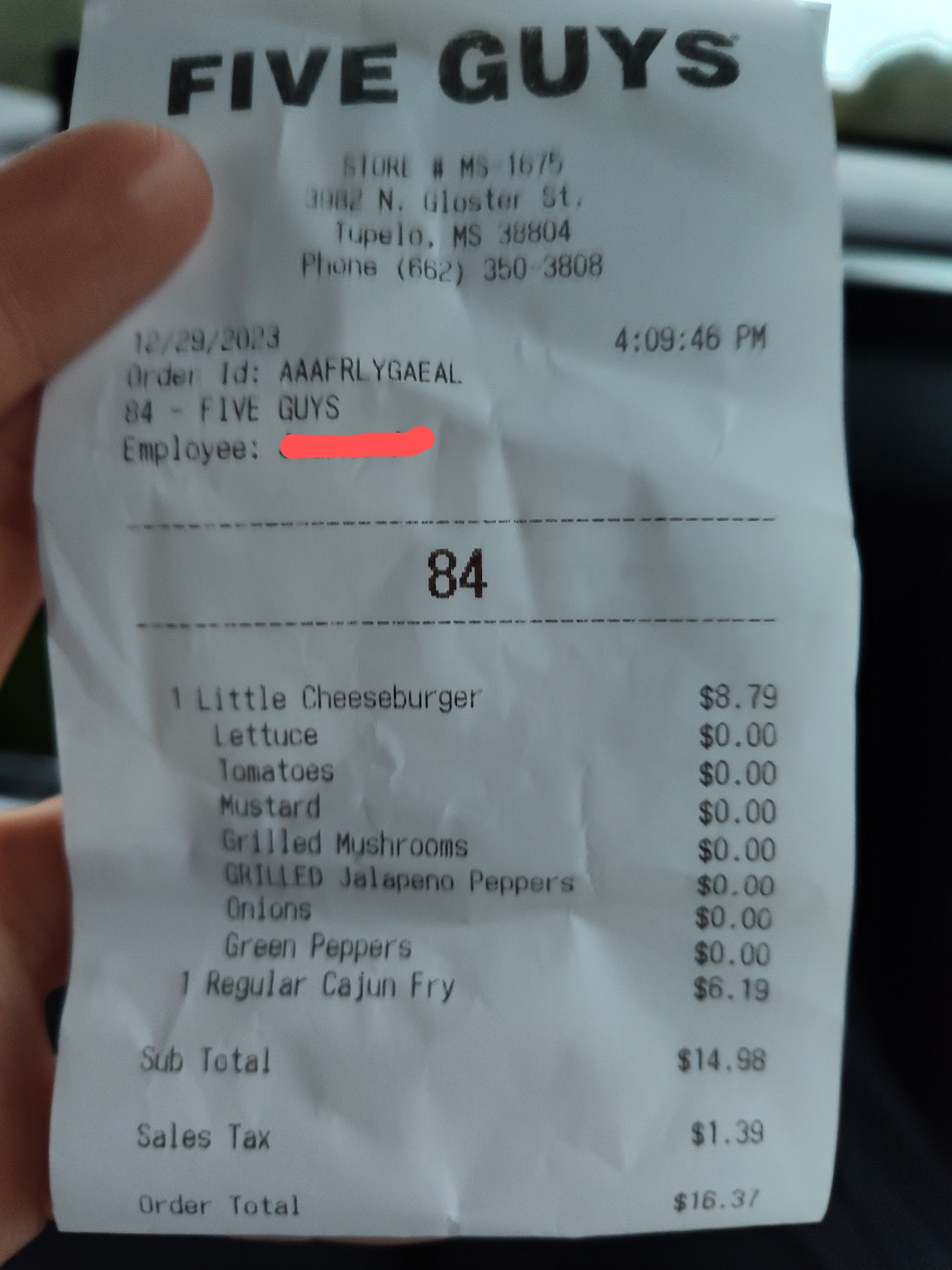 Value - Very, very, poor! For the 12 bucks and change , I wanted an ultimate burger experience. I asked for purple onion , but that wasn't an option.. sure they had white and grilled , but for a premium burger, I feel purple is a must. Iceberg lettuce, the least flavorful of the lettuces, was the only lettuce available. The other add-ons didn't sway me to try something new. I've had burgers from fast food to casual dining, plus I make a mean burger at home on the Weber, burning mesquite chunks , toasted, buttered buns with cheddar and bacon with grilled onions. There was nothing unique about the burger at FG's. I live in a small town and I don't go to Tupelo that often, when I do, I want to enjoy the extended options of eateries that's I don't have locally. I completely wasted my time and money on Five Guys. For a better choice in taste and value go to one of the following: George's in New Albany, Hardees , Burger King , Wendy's , Sonic, or any burger from a steak house. I have gotten better burgers at each of these places, especially at George's. I have not tried Mugshots or similar establishments. I had heard by word of mouth that Five Guys and Mugshots had great burgers , though a bit pricey, so it wasn't just the price that was disappointing; it was what I received for the price that disappointed me. Maybe my expectations were a bit high, but for the price premium I felt high expectations were warranted. I went in hoping for a unique atmosphere and a delicious burger. So if your like me , the only unique experience you will get at Five Guys Burgers and Fries will be the price. You will pay more than you have ever paid before for a burger; and it won't come close to the best burger that you have ever had.