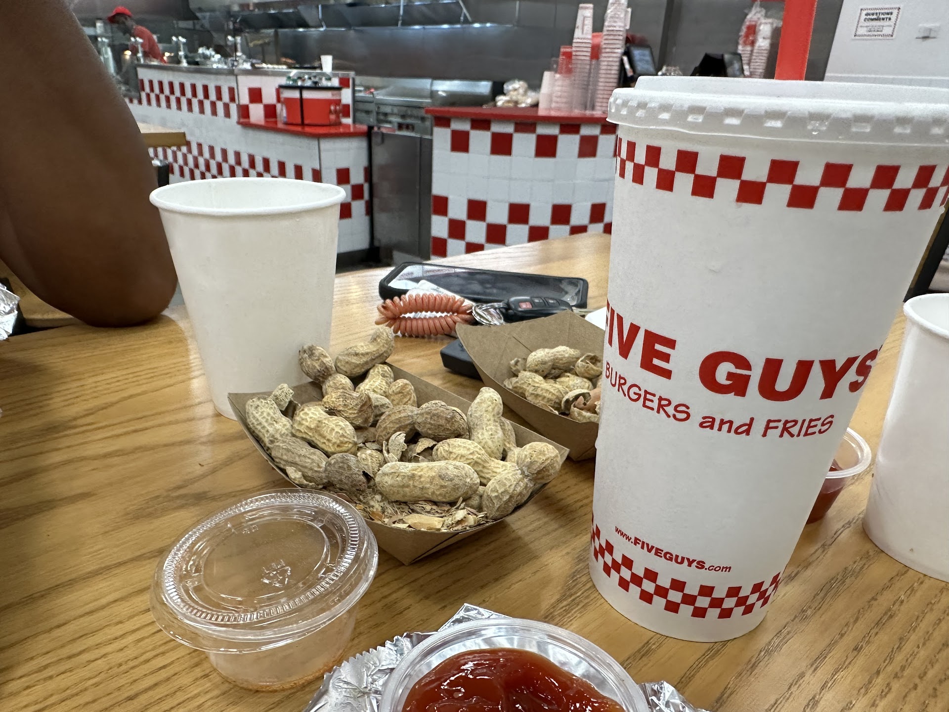 Service and Presentation - Very fast food like . Order numbers were assigned, and hollered out when ready. You were expected to walk to the back counter to get your food like a Burger King or Wendy's, even though your paying a casual dining price. The peanuts on the floor work at Logan's with the rustic Road House look and feel with the wooden floors, but the peanut hulls on the floor at FG's just felt dirty and gritty, as your feet will slide around on the tile floor. The red and white had more of a abandoned hospital/asylum feel from a horror movie set in the 40's, but with better lighting. The sacks of potatoes in the dining area was a bit confusing, it had me asking myself "Do they sell those sacks of potatoes or did they just run out of room in their stock room." The complimentary peanuts were self-serve from a huge cardboard box lined with a trash bag set on top of the checkout counter; a wooden barrel or something a bit more permanent could have added to the décor. I was told that Five Guys was started by some firemen , though a quick web search could not confirm that. Maybe they were going for a fire station theme , but I didn't see it , and it didn't work for me.