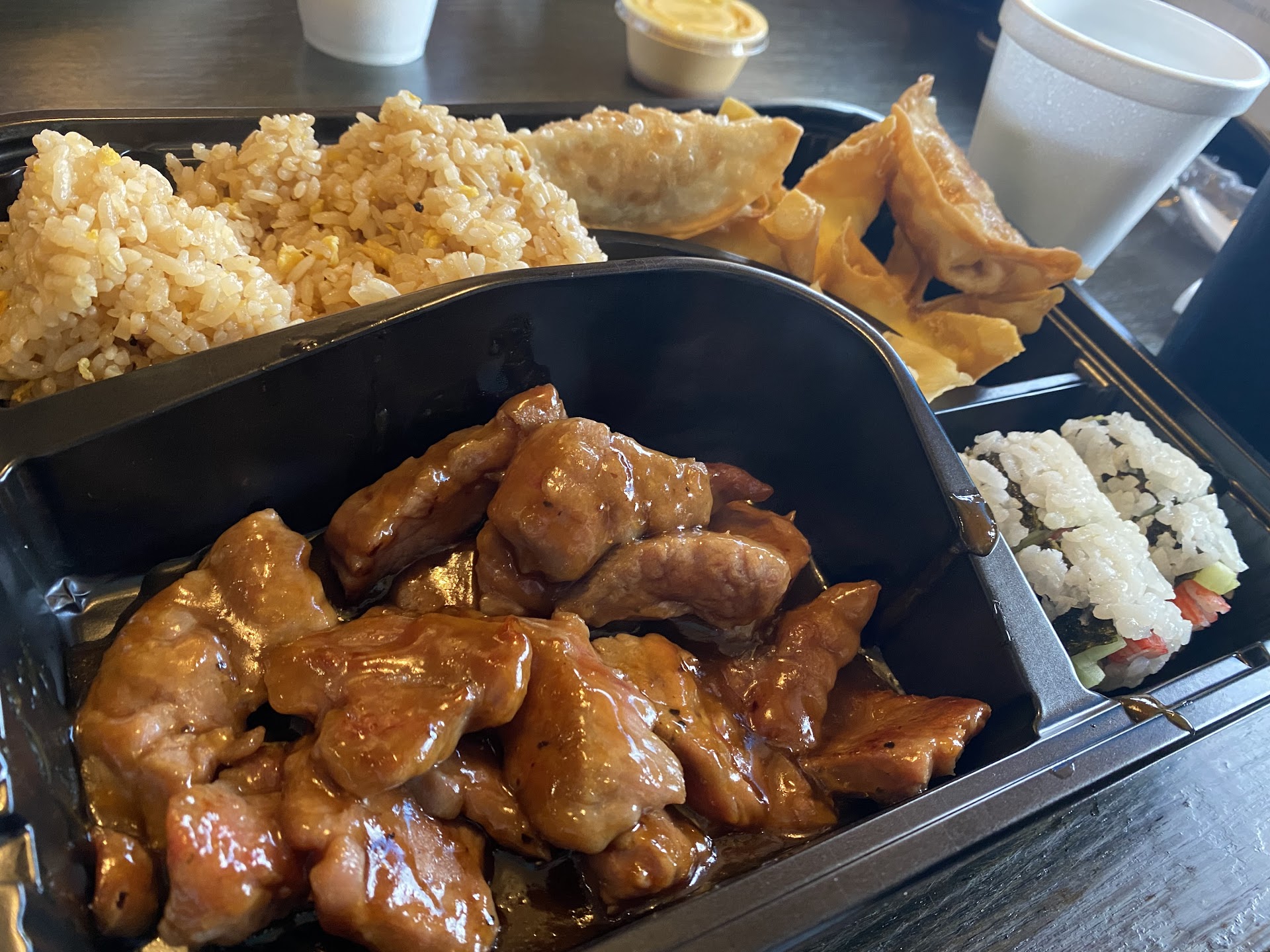I popped in for a late lunch with my daughter and we were starving. The place was expectedly quiet for our 3pm arrival, but we were seated quickly by our waitress and attended to swiftly. I ordered the 2 roll sushi lunch that came with soup and salad and an egg roll appetizer for the kiddo. Everything was served in to-go boxes, with the soup in a cup, salad in a styrofoam container, and very flimsy plastic utensils in a bag. The ginger dressing on the simple iceberg and carrots shaving salad was good. The soup wasn't very flavorful, but was hot and had plenty of mushrooms floaters...needed salt. I got the Pacific roll and Philadelphia roll, but neither were great. I didn't finish either because the Pacific didn't taste like much and the Philadelphia had very, very tough salmon. It won't be my go-to sushi place, but I did talk to another patron with a heaping styrofoam to-go box of hibachi chicken w/ noodles that said it was good, just wasn't as flavorful as she hoped. She added soy sauce and yum yum that was available on the table. The egg rolls tasted like they were frozen and from a bag, so definitely not something we will get again. Hopeful for a better experience next time, but would order...