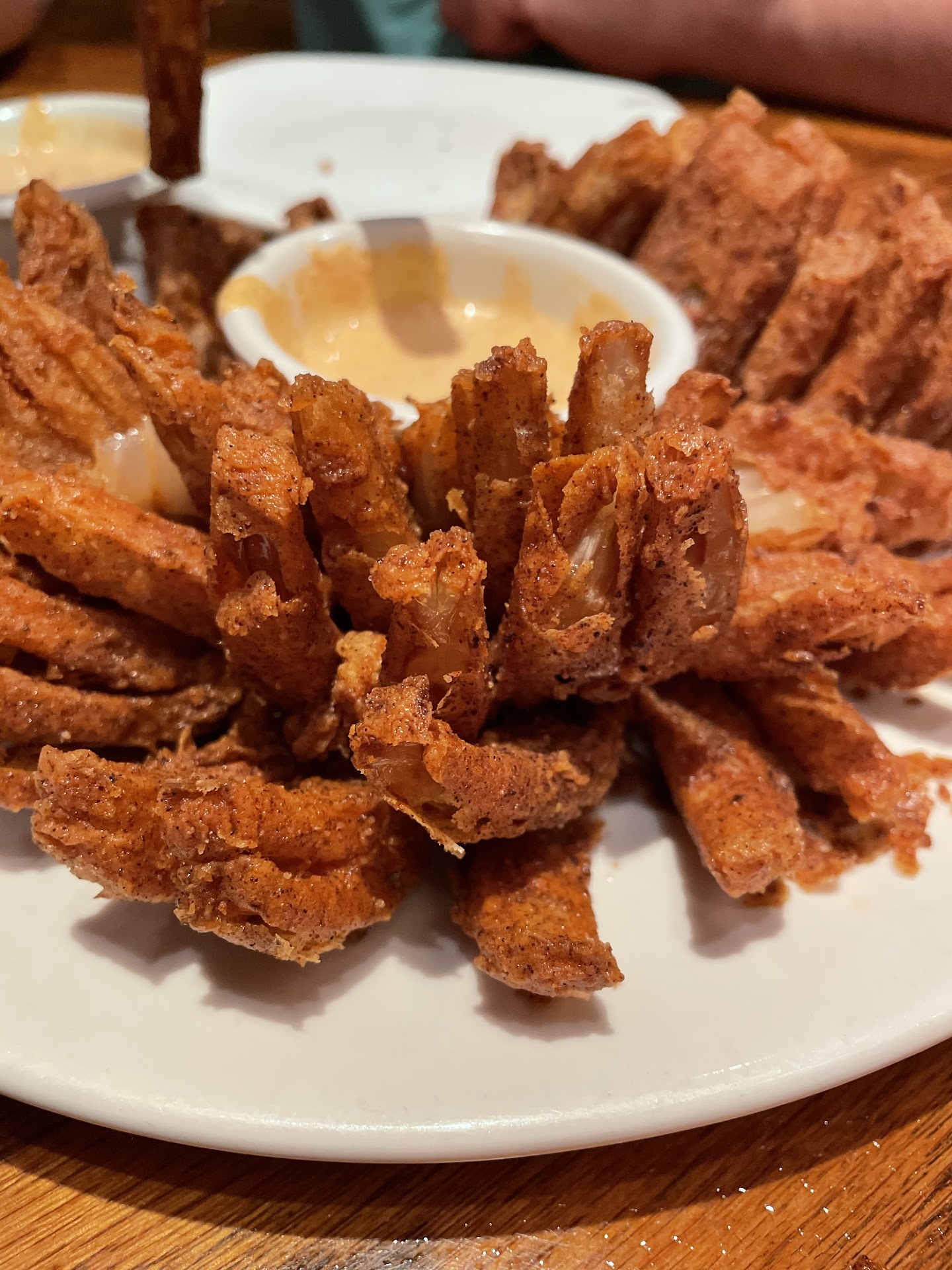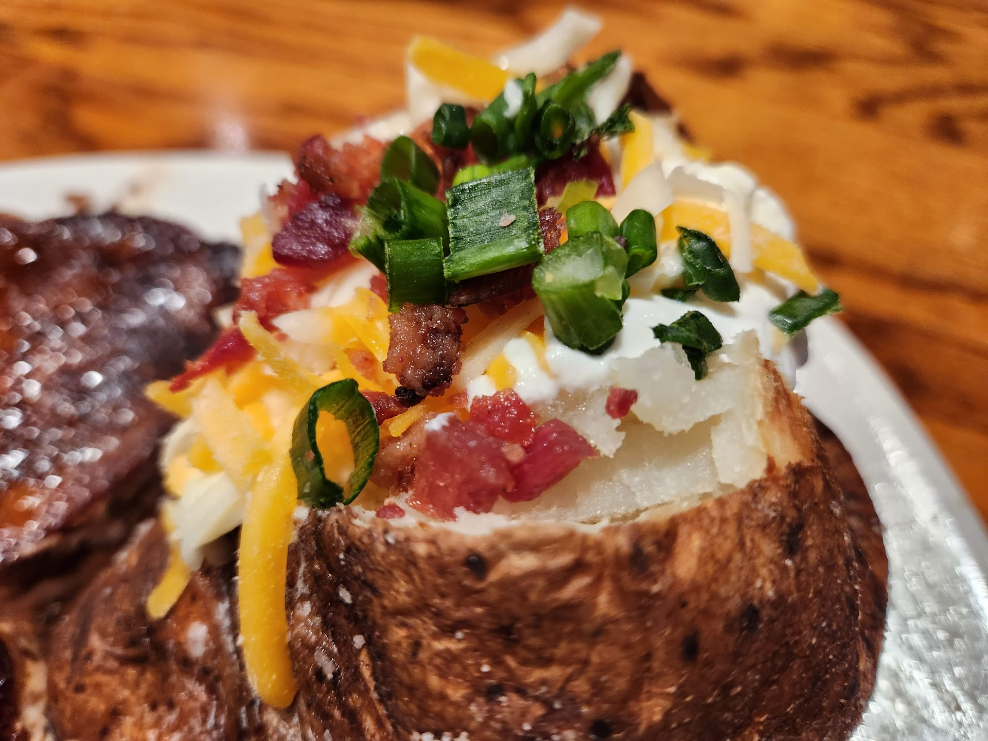 My friend ordered the bone-in ribeye medium, and it came out rare to medium rare with the majority of the steak being fatty and inedible. I ordered the pork chops, and they were absolutely delicious, perfectly cooked. The loaded baked potatoes that we both chose as sides were well topped, but the skins were too thick and dried out to eat. We both upgraded ($1 more each) to the blue cheese and candied pecan salad, and disagreed on it...he loved it, and I thought it was watery, looked yucky, and only had flavor when the rare bits of candied pecans were on the fork. My daughter ordered the Joey sirloin medium, and it came out very well done. She gnawed on a few bites, but ultimately just ate the fries and one of my pork chops.