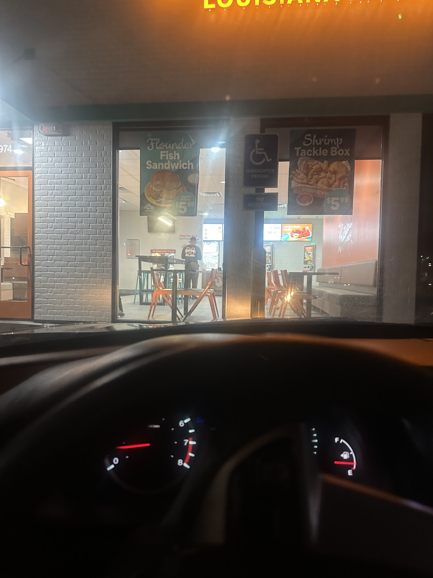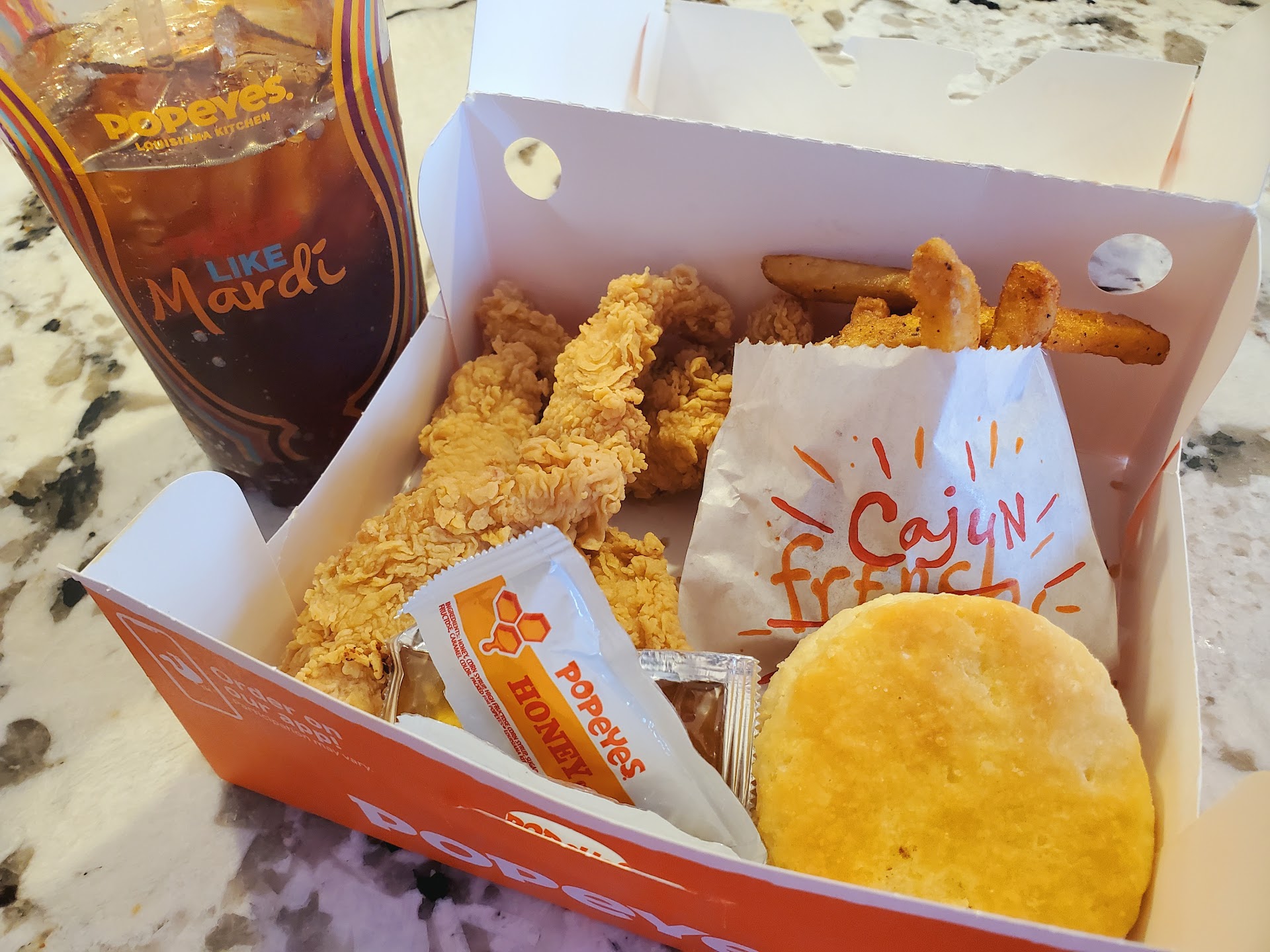 Read more1st time ordering at this location. I prefer to order from online/app when we are not dining in. It's quicker at most places. Looked online at Popeye's menu & it appeared very easy to order ahead online. So we decided to grab some lunch there to eat on the way home rather than another place. We placed our order as we were leaving Longtown Medical. Took about 3-5 minutes to get to Popeyes. There was a huge line in drive thru. I chose drive thru pickup & knew this would give more than enough time for our small order. Let them know I had online order & they confirmed receiving it. Finally got to the window & they hadn't even started our order apparently. I was told to pull up & there was barely enough room. We waited almost 40 minutes in the hot sun. Everyone else received theirs at the window. They did apologize when they finally brought our food. And the food was good, ngl. We spilt an order of the new thin chicken bites. And I had the spicy pickle chicken sandwich. It was good but I couldn't eat but a couple of bites. I didn't order a drink because I had a full one when we headed there. I ended up drinking all of it sitting in the hot sun. The rest of the sandwich wasn't good reheated. My mom got a chicken wrap special & she said it was good. I know this review is long but I want people to know unless you can wait nearly an hr from the time you place your order till it's ready, don't ever order online. At least at this location. Even though the food was good I will never go back to this particular Popeyes. I order online at different places pretty often & I have never had to wait that long,...