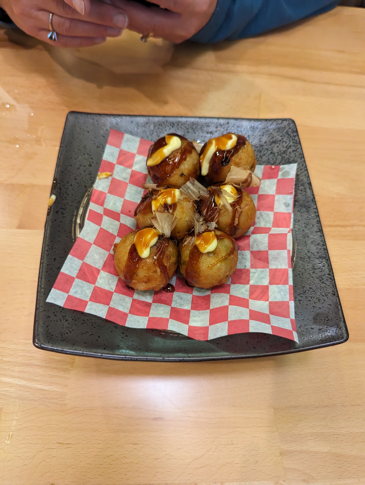 The waitress arrived and asked us what we wanted to drink. I told her we were all getting combos, so we wanted the Thai tea as well as a water. She said they no longer offer combos because it is too hard to keep up with. This seemed odd because it was prominently featured on their menu and it was a tea and a bun. I said okay and ordered our beverages as well as a Takoyaki octopus ball appetizer. She left and was gone for longer than I expected, but she was busy. I also overheard two tables try and order the combo, you would think they would remove this from their menu.