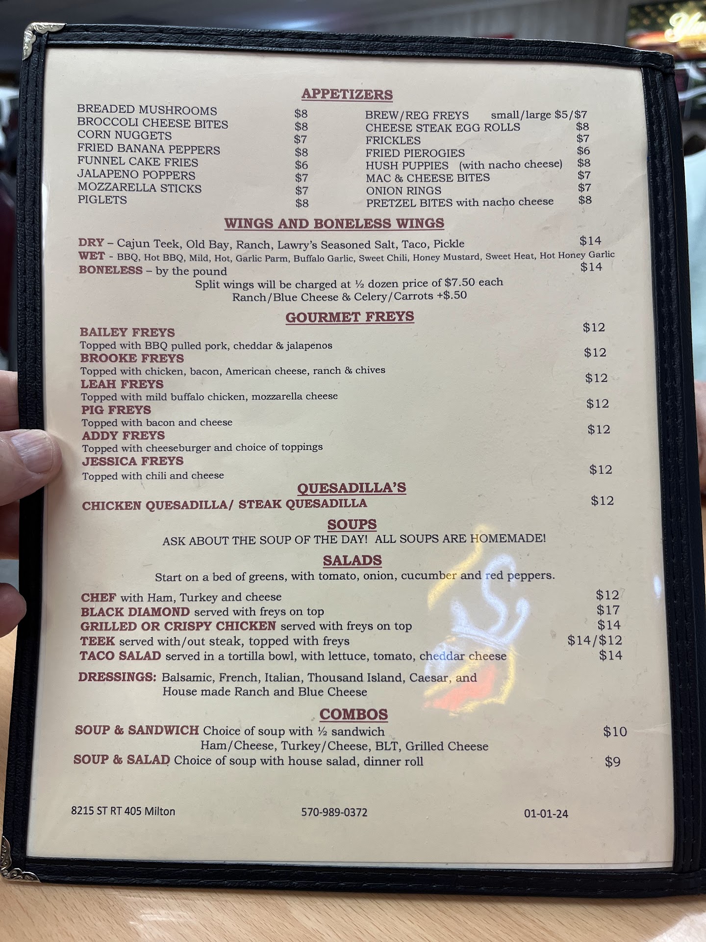 Read moreOmgoodness!! -People!: AWESOME!! You've just Got to go here!! Home/hand made Everything! I just want to go on n on n on about the Friendliness! -of the staff! -and patrons ..the top quality of food! -Just the absolute most nicest people that come there to eat! Every time I go there the indigenous crowd is so pleasant!! Real America! This is how it should be everywhere! I went there on a cold, cloudy, post rainy afternoon n it was take out only bcz C-virus n the parking lot (big lot) was empty.. Now normally this raises red flags for me however, given the circumstances of the times and that it's a relatively small town I wasn't worried, especially after poring over the menu n reviews for 40 minutes before I called in my order ( I was at a rest stop on the I 80 about 8 minutes away) -well let me tell you: -I've been back there 4 more times since starting this review and it is a really, really good place to eat!! Very reasonable prices!! The Clam Chowder, double bacon cheeseburger, Susquehana omelette, chili, fried green tomatoes, all like we made back home on the farm, ..killer milkshakes! -and all kinds of pies! some items like the mac n cheese, n spaghetti, I found to be just ok, though they Were good... just not fantastic, in my opinion.. -Only 3 minutes off the I-80 n 180. Super easy in n out! This place simply has to be scheduled in on your trip for Breakfast lunch...