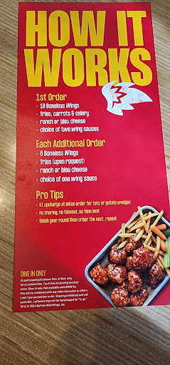 Read moreJust went on a Monday to have the all you can eat boneless wings. Rules state start with 2 "sauces" flavors on the first order of 10 wings. The next order can be your choice of sauce. What they don't tell you is that it only 1 of the first 2 that you pick. It's all you can eat for 2 flavors no exceptions unless they screw up your order. We spent an hour and a half waiting for a total of 15 wings. It's $19.99 yet order came out to $26 with a drink. Staff was completely rude to a customer behind us making fun of them for how the rules were changed once they got their first order. My wings came out completely wrong flavors and when staff asked if I wanted it corrected still took 30 minutes for 5 wings to arrive and still be cold. Buddy ordered wedges and the next order that came were stale French fries even though he upgraded to wedges. They won't let you order the next round of wings until your done eating and even then they still have you wait 30 minutes before they arrive. Offer is misleading and false advertising. Should state all you can eat 2 flavors. If so would have went somewhere else. My first order of wings was garlic parm and honey BBQ regualr fries. My buddies was Asian zing and lemon pepper dry and wedges. I got garlic parm and Asian zing and lemon pepper fries. My buddy got Asian zing and garlic parm wings with wedges. Second round I got the honey BBQ finally after 30 minutes of waiting with plain fries and my buddy got his order of asian zing again with plain stale fries instead of wedges. Took another 30 minutes to get another round at that point it was useless to stay any longer since it seemed like they cook one...