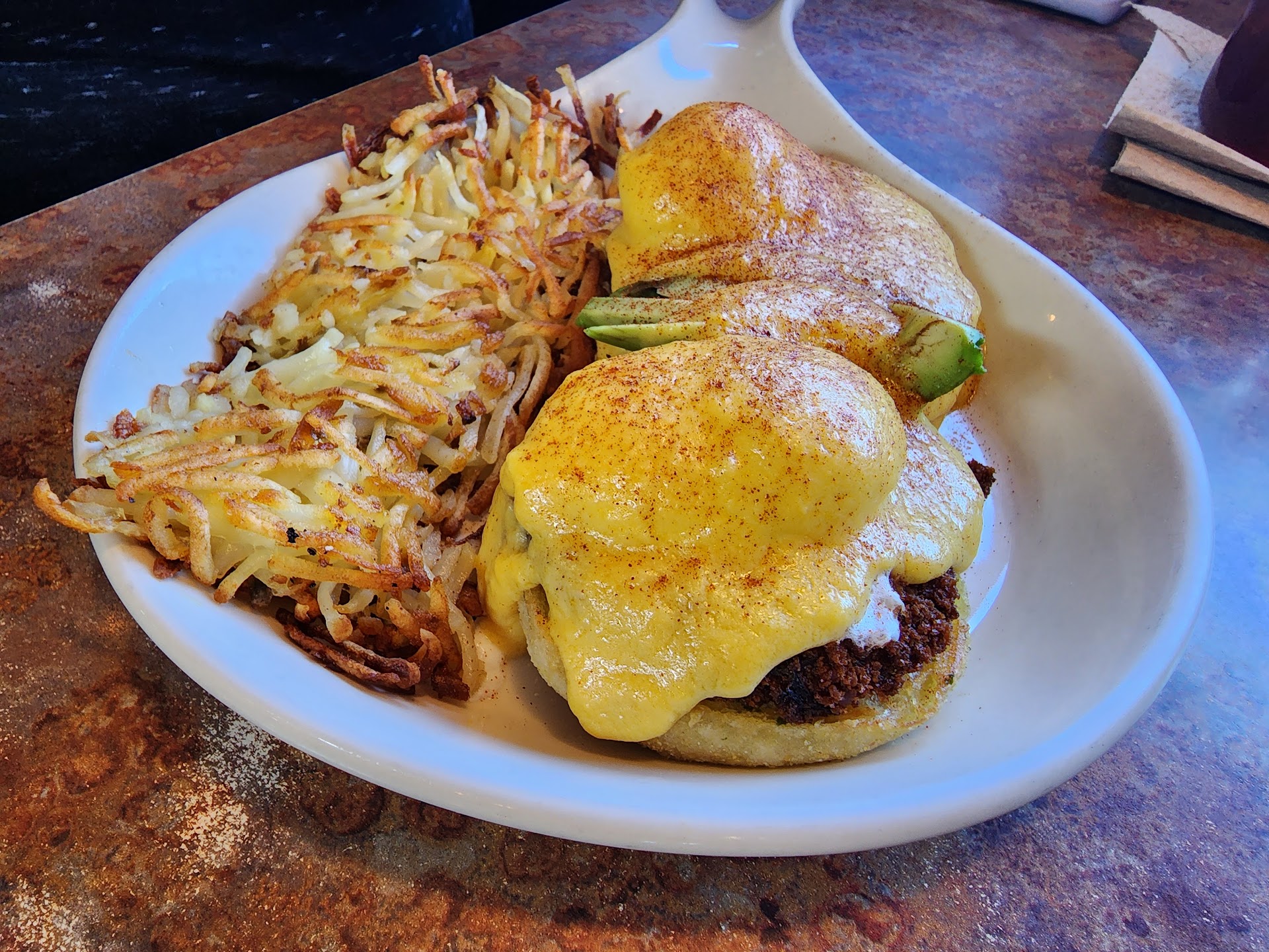Read moreStopped for breakfast. I started with a mug of hot chocolate while my partner had coffee. The only possible fans that they could have for the hot chocolate must be kids because it comes with a solid inch of really thick cream. And, I mean REAL thick! I am NOT a fan. I ordered 2 eggs scrambled with sausage (they are links vs patties). There are no items listed a la carte, but they are available. The food was typical breakfast fare. My partner ordered 2 slices of French toast with bacon. It was a good thing he only got two slices of toast as those took up the entire platter! The 2 slices of bacon looked rather pitiful on a platter all by themselves, but they were edible.