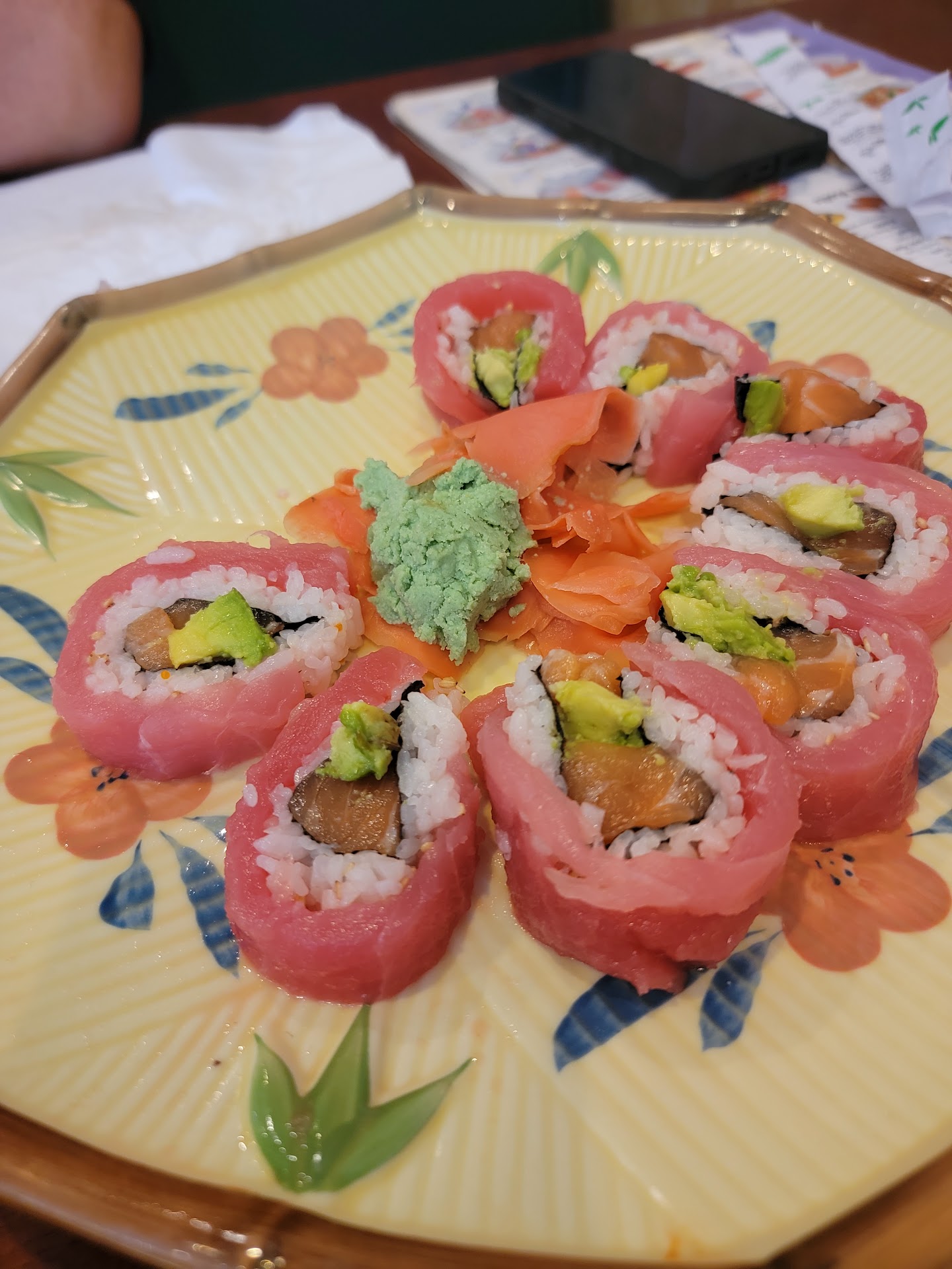 Usually I would rate this place higher, but I'm basing this solely on my visit a couple of nights ago. My niece and I arrived and were seated at the only table left, the place was pretty packed. We placed our drink order...water and hot tea. The tea smelled and tasted like SEASEME SEEDS. WTH. Totally disgusting. We placed an order for the cucumber salad appetizer, and each one of us got a roll. The cucumber salad came and it was FOUR slices of cucumber. The rest was seaweed, and some rice noodles in what tasted like Miso soup. Absolutely horrible. We couldn't eat it. The rolls came and the flavor was good but they weren't cut properly. Most of my pieces weren't cut all the way thru, so everything fell apart while trying to separate them. Some pieces were cut too thin, while others were too big. The sushi chefs were really young (they looked to be about 12 years old lol) and clearly inexperienced. I'm sure the presentation will improve with practice. Flavor wise, the rolls were good, but they were really hard to each with chopsticks as everything fell apart while trying to separate the pieces. It looked like a child had been sitting at my seat making a mess. I'll go back, but I'll never order tea or the cucumber salad ever again. I hope someone that has the ability to make some changes at this establishment reads this post...they...