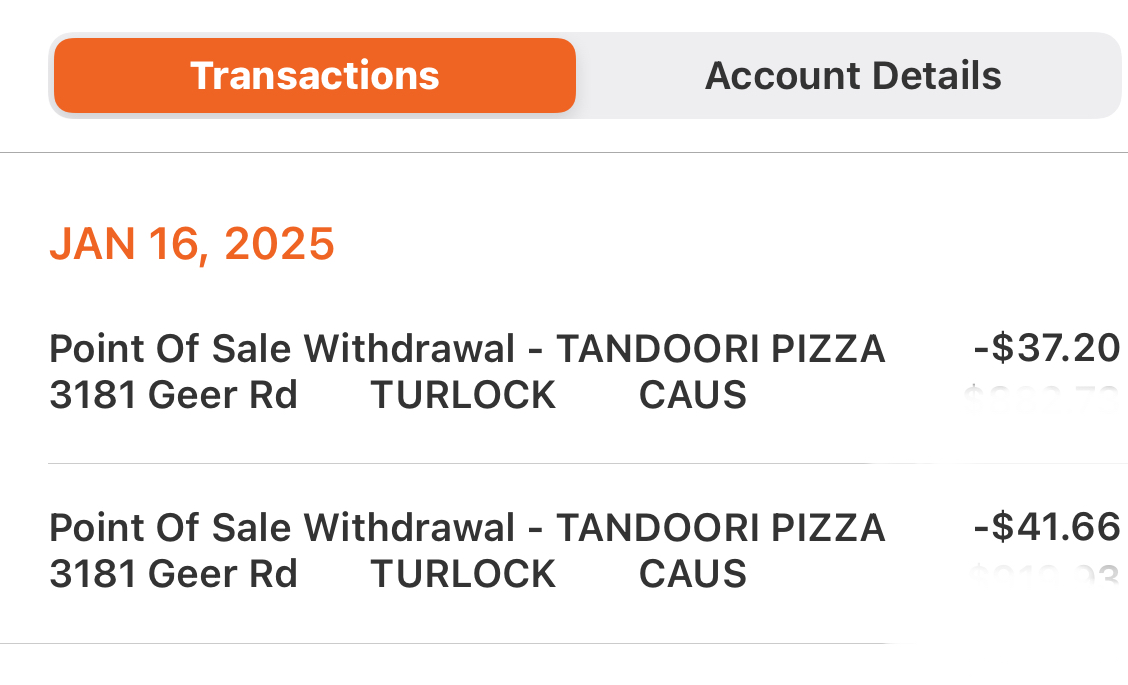 Read moreDrove from Riverbank on Jan 15th to have pizza on my husband’s birthday. We ordered one large pizza and two drinks. Pizza ordered was half chili paneer and half curry chicken. We were told by the young man working that paneer was out of stock. Half the pizza was chili paneer without the paneer. I ran my debit card and was told that the transaction didn’t go through. I had added a tip to the first transaction which totalled $41.66. I ran it again and did not add a tip which totalled $37.20 and signed the receipt. Now I have 2 charges to my account totaling over $78. I called my bank and was told that Tandoori pizza should easily be able to refund the additional transaction. I just got off the phone with tandoori pizza after speaking to at least two people. They have no record of the second charge. I now have to go to my bank and dispute the additional charge. Just a hassle. I recommend cash only if you decide to visit. Pizza flavor is great although the amount of herbs has definitely changed from when they first opened. They used to pile fresh herbs on top and the pizza was outstanding. Also, no paneer? Just disappointed that we drove so far for an $80 pizza that I am going to have to take time at my bank to resolve. I was told that they don’t have a way to contact the company who issues charges for them. That doesn’t really make sense to me and although I was told that this issue “is not about customer service,” it is about customer service. Tandoori pizza needs to figure out how to resolve issues like this or get a different company to run your credit/debit cards through if in fact they are have no way of...