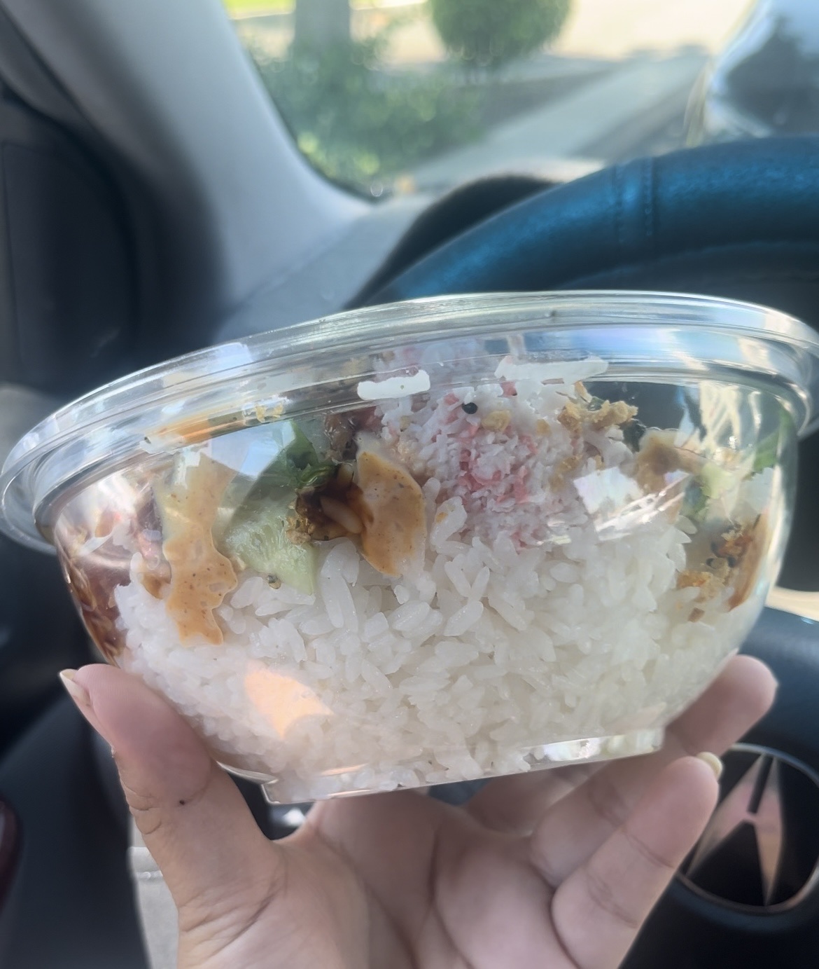 I ordered the large bowl (2 scoops of spicy tuna, 2 scoops of salmon, 1 scoop of r&c mix, crab salad, green onions, white onions, seaweed salad, cucumber, furikake, shredded nori, crispy garlic, spicy tempura flakes, spicy mayo and unagi sauce). Just so you can get an idea of how much is in this bowl and how much there is. Proportions wise, I do think itās way more rice than the scoops in total. Even when I did end up mixing everything in the end, there was just so much rice that the proportions of rice vs all the toppings was too much. Same for the sauce, I feel like they did go very light on it and could go just a lil bit more on it.