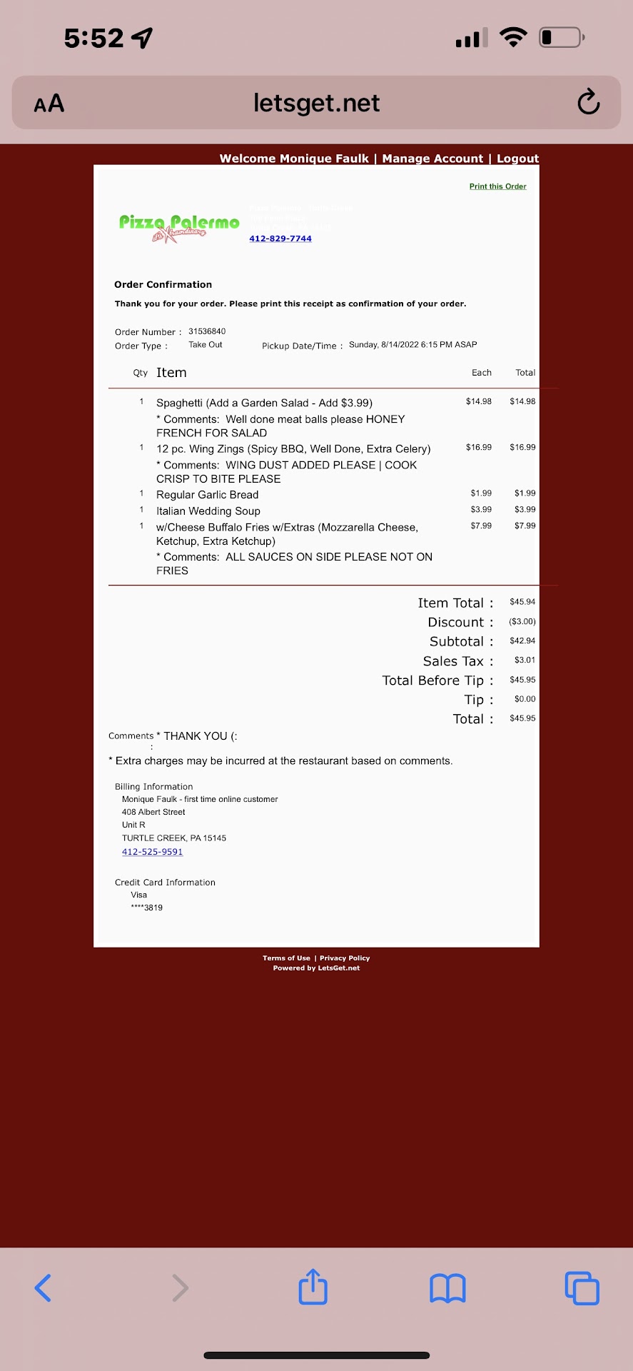 CHECK YOUR TOTAL PRICES I have ordered from Pizza Palermo for quite some time now. The food has always been amazing. Today, I noticed a way that they have been ripping us off. They do NOT allow substitutions for their menu items, although they give you options for other/additional items. (I expect to pay for additional items) Nowhere on their website does it state no substitutions without a fee. Take a look at the pics attached. Regular whole steak hoagie $15.99, I removed most of the topping except lettuce and changed the cheese from mozzarella to cheddar. Paid $21.97. WTH $5 more and you used less ingredients to make this than the standard offering in your website. I mentioned this to the young girl working. Her only answer, after telling me they don't allow substitutions, was to cancel my order. Umm, wrong answer, how about I will credit you back $5.00 and now you know. I guess it is my fault foe not looking closer at the cart, but this is still a horrible busineass practice and at this point they have made probably close to $100 in change fees off of me. No more!! And before anyone comments that I didn't tip, this was a pick-up, their prices cover the making...