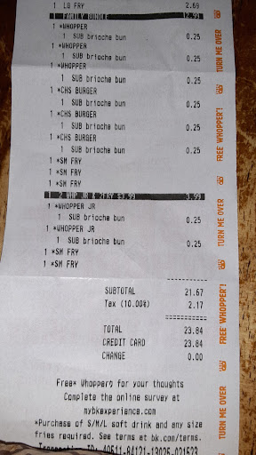 Read moreWhen I initially got my order from the window I noticed that the impossible whopper looked burnt. She said that's how they are when I showed it to her. I told her I eat them all the time so she took it back and had us pull around the front to wait. I go back in to wash my hands so I wait for my burger. She gives it to me and I ask does it have cheese. She ask the person who prepared it and they said yes. I pull off and immediately noticed no cheese that I paid extra for and then I am so hungry I just bite into it and it's BEEF AND NOT THE IMPOSSIBLE WHOPPER. This is a problem because I don't eat beef and haven't eaten it in years. So money totally wasted. Tea also tasted not like sweet tea. Not sure what it was. The fries were also cold. Super disappointed. I typically don't send food back because of fear of retaliation but I this time I did and ended up not having anything to...