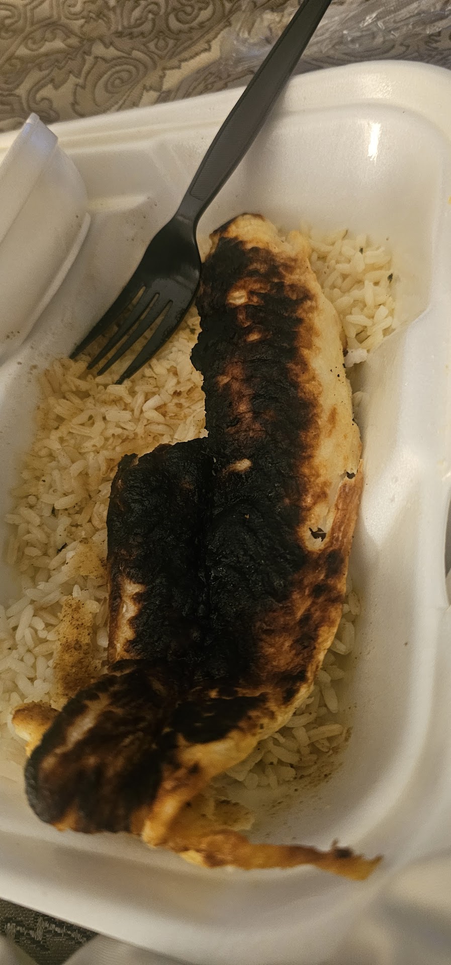 The batter fried fish appeared to have been cooked in very old oil: 1)There was a heavy dusting of black flecks on the crust of both pieces of fish, and the crust was soggy, discolored, and had very little crunch. 2)The taste was Poor, with a burnt, smoky hint to it. The fries and coleslaw were Very Good to Excellent. A picture of the plate is included with this review. Iced tea and a cheesecake wedge with strawberry topping were also ordered. The quality of these was Very Good.