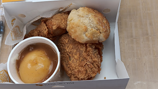 Read moreThe staff is friendly and the food overall was good. The mac n cheese was good despite the cheese being really cheesy and I understand that some people like their mac n cheese really cheesy so no judgement there. The cream potatoes already came with the gravy so that's good and they pretty much tasted like average mashed potatoes and gravy and it's similar to Bojangles and Lee's. The biscuits were on top of this world I've never had a sweet biscuit before so that was my first time trying one. Definitely woulda went good with some jelly. The chicken was good and has a different flavor compared to KFC, Popeyes, Bojangles, and Lee's. The service was great and I've never been inside the restaurant itself but I'm giving the atmosphere a 5 out of 5