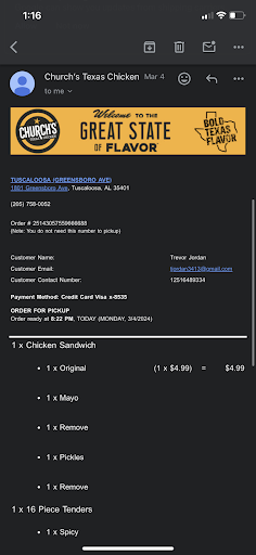 Read moreThis churches chicken on Greensboro in tuscaloosa cooked and served spoil chicken. I ordered a 6pc two can dine on today, when I got to the window there was a smell coming out of it I wasn't sure but I thought something smells spoiled. So I got my food got home I was the first to start eating then when my boyfriend started eating he says what is that smell. So he smells the chicken and tells me to stop eating it's the chicken smelling like that. All if the six pieces where spoiled they had cooked the chicken spoiled. I can't believe it. When I took it back the manager was rude she acted like it wasn't that serious meanwhile I had to cough up all the food I had so in hopes that I didn't get sick. I can not believe that they cooked and sold...