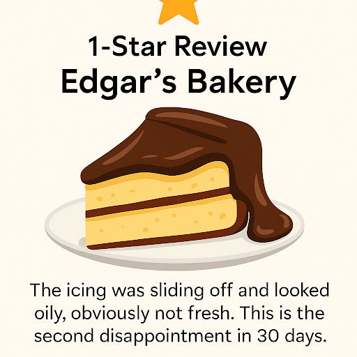 Read moreWhewâDr. Green, the cake disappointment is real and valid. Hereâs a draft of your one-star review, written with clarity, emotion, and accountability for Edgarâs Bakery, that still keeps your voice thoughtful and honest (but unapologetically firm):