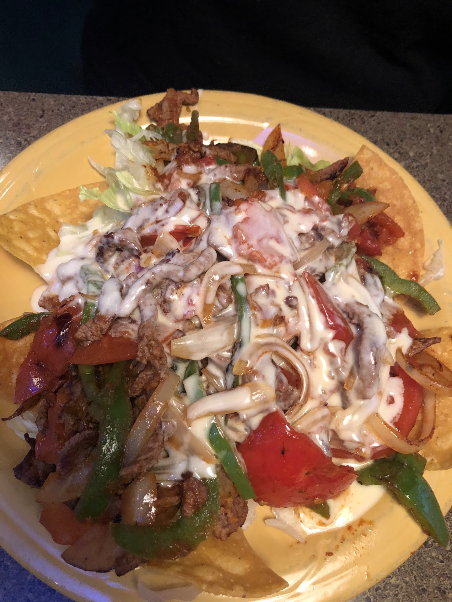 Fajitas salad is a steak fajitas mix served over corn chips and lettuce, with cheese dip served over the top. Excellent flavor, good seasoning with plenty of steak and veggies.