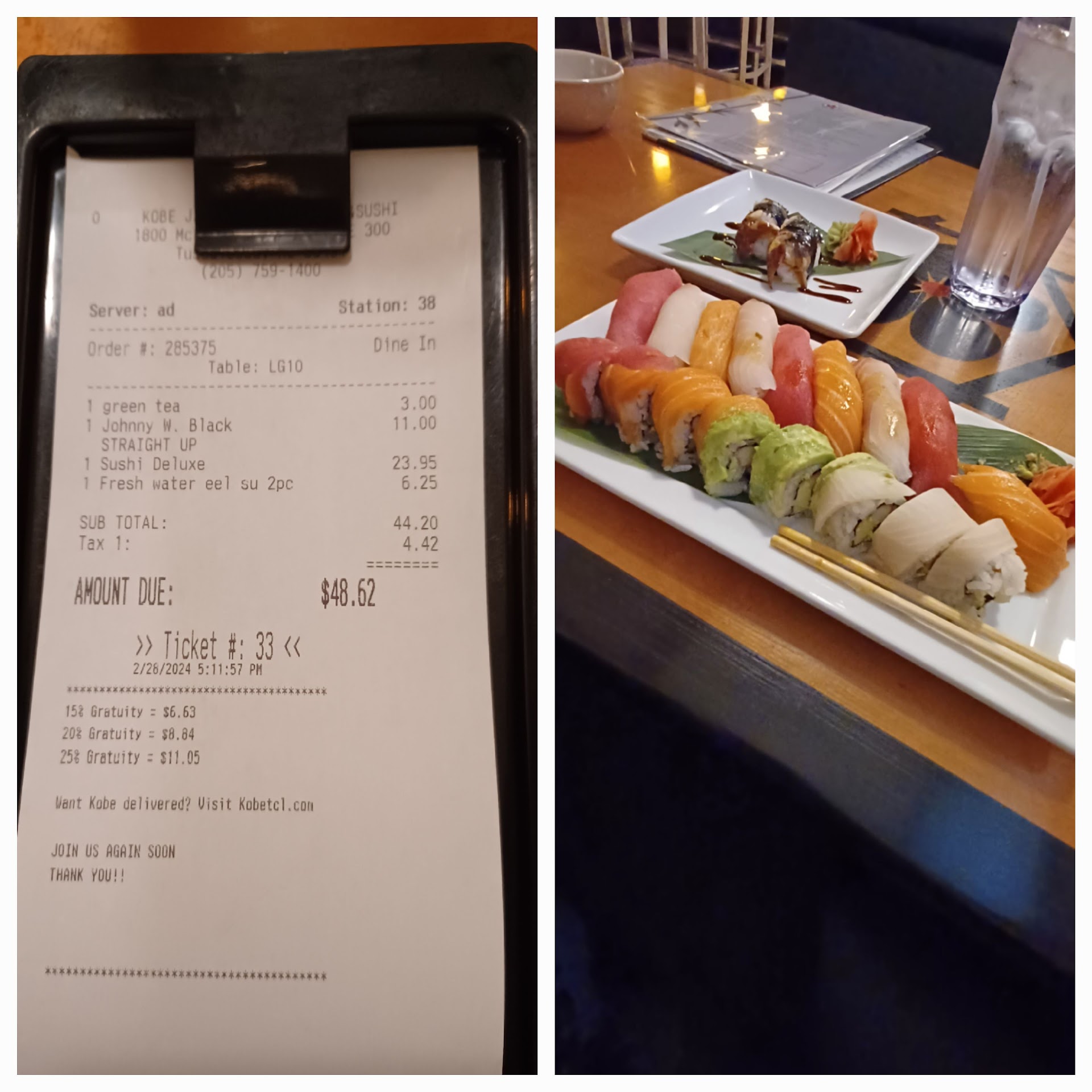 ย ย ย Read moreMy husbands warning after Saturday night at the Kobe in TTown. He was being nice when he wrote this, it was much worse. :( "So last night we tried Kobe steakhouse here. Hands down the worst experience I've ever had at a restaurant. It started from the hostess and finished with "the manager". Hostess did not pay attention and put brown instead of Brian, so we went from a 10 minute wait to 45 minutes. The waitress seem to get lost finding her section multiple times and I guess we were an inconvenience because we went out for dinner. Never once did she check on us or anyone else sitting with us. I am allergic to shrimp and told her, to which she said they are very careful and take that serious. Then the cook dumps noodles and shrimp down right next to each other to start cooking. Then said he had no idea, because the waitress didn't tell him. The manager never came to the table, even after someone else said something. If the food was better it might have made up for it, but it was prepared very sloppily and at high temperature. At one point he burnt my wife slinging food around. I can't believe how terrible this place was and that it stays in business." All in it took three hours for dinner. Two other groups at a grill adjacent to us came and went while we waited. Add insult to injury one of our DD's friends', who was with us, has a cousin that works the bar there and was mortified at the atrocious experience. The second group sitting at the grill with us were three lovely African american women who couldn't even get the waitress to address them. At one point I excused myself to the bathroom and spoke with a manager about it and still nothing. I will be honest, when we FINALLY were given our bill and CC back I lit into the manager, as I had hit my wits end. The owner stood idly by and never so much as apologized. That only irritated me further, so here I am making good on my word telling every UA person I can to avoid that...