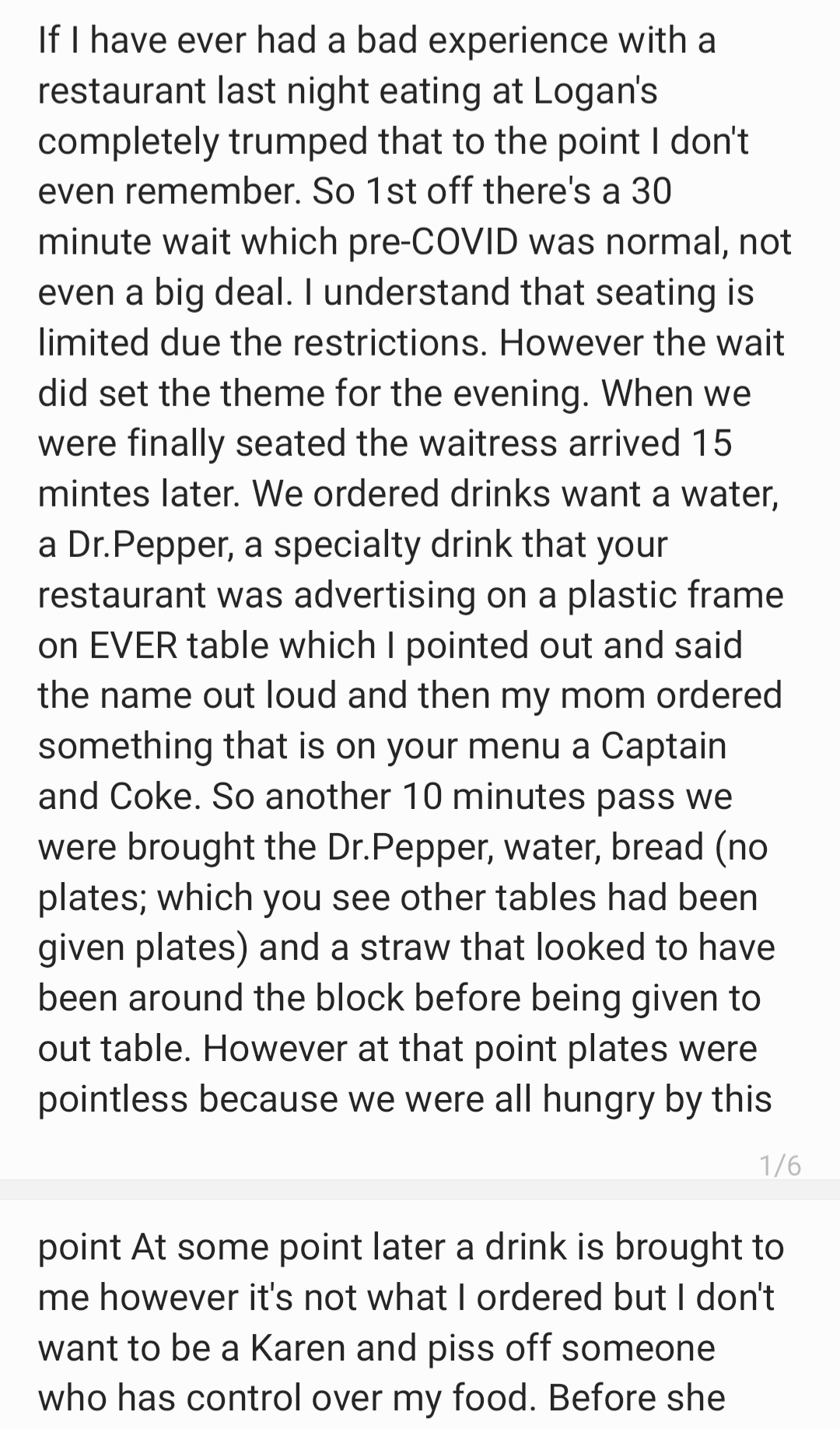 Read moreLogan’s has always been our “Go to” before Covid, sadly they have done away with the main things that kept us all coming back for more. No peanuts, like Zero! Teriyaki glazed with grilled pineapple & chicken over rice is now half the chicken breast and small portion of rice.. Also, if this isn’t enough, the potato was very small and they do not serve grilled veggie skewers. I’m guessing due to fresh cost more so they lowered the quality and the flavor. I asked our waitress if anything was fresh, she honestly said, nope. Not even the salad, tomato from a can, green beans, broccoli frozen…. And they no longer offer croutons, and no longer have red onions. Only white, so I had to ask for onions with my salad. They no longer offer crackers you gotta ask. We all know COVID has been awful on us all, however if I’m paying almost 75.00 for 3 mid-day meals…. I’ll go where the quality, quantity, flavor & atmosphere leaves us wanting to come back. Sad that Logan’s has lowered its standards/portions while raising prices. We don’t mind paying more as we all know the economy is bad but don’t insult our intelligence with low quality food from a can or frozen broccoli and smaller portions. We couldn’t eat the salads, Not sure if it was the bagged salad or the canned watery tomatoes but it was gross. Oh! And don’t get me started on the cheap quality beef/steaks. This message is for upper management/owners or whom ever made these ridiculous decisions. Even your employees are embarrassed, If you want cafeteria food at steak houses prices, this is your place. We will not return, we expect high quality meat that is fresh and vegetables not from a can and Logan’s no longer offers this. Again, this isn’t against the employees, please forward to the appropriate management headquarters. RIP to the prior Logan’s, sadly seems Covid...