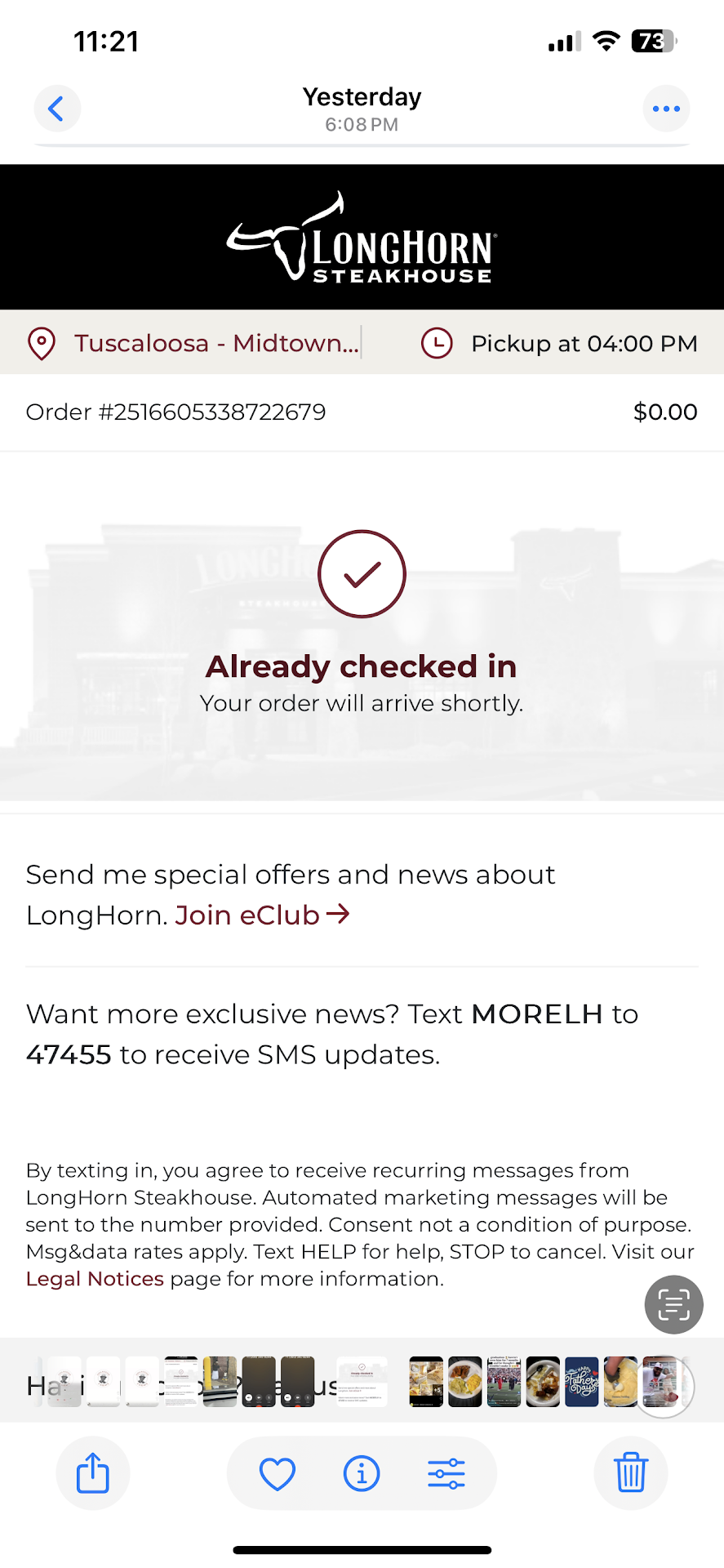 REVIEW FROM PREVIOUS VISIT: Every time my family and I have been to LongHorn Steakhouse in Tuscaloosa, we've always had a great experience. I highly recommend the porterhouse steak cooked medium rare. It's awesome!! The wait staff is so accommodating, and they make every visit special. We just love our visits...