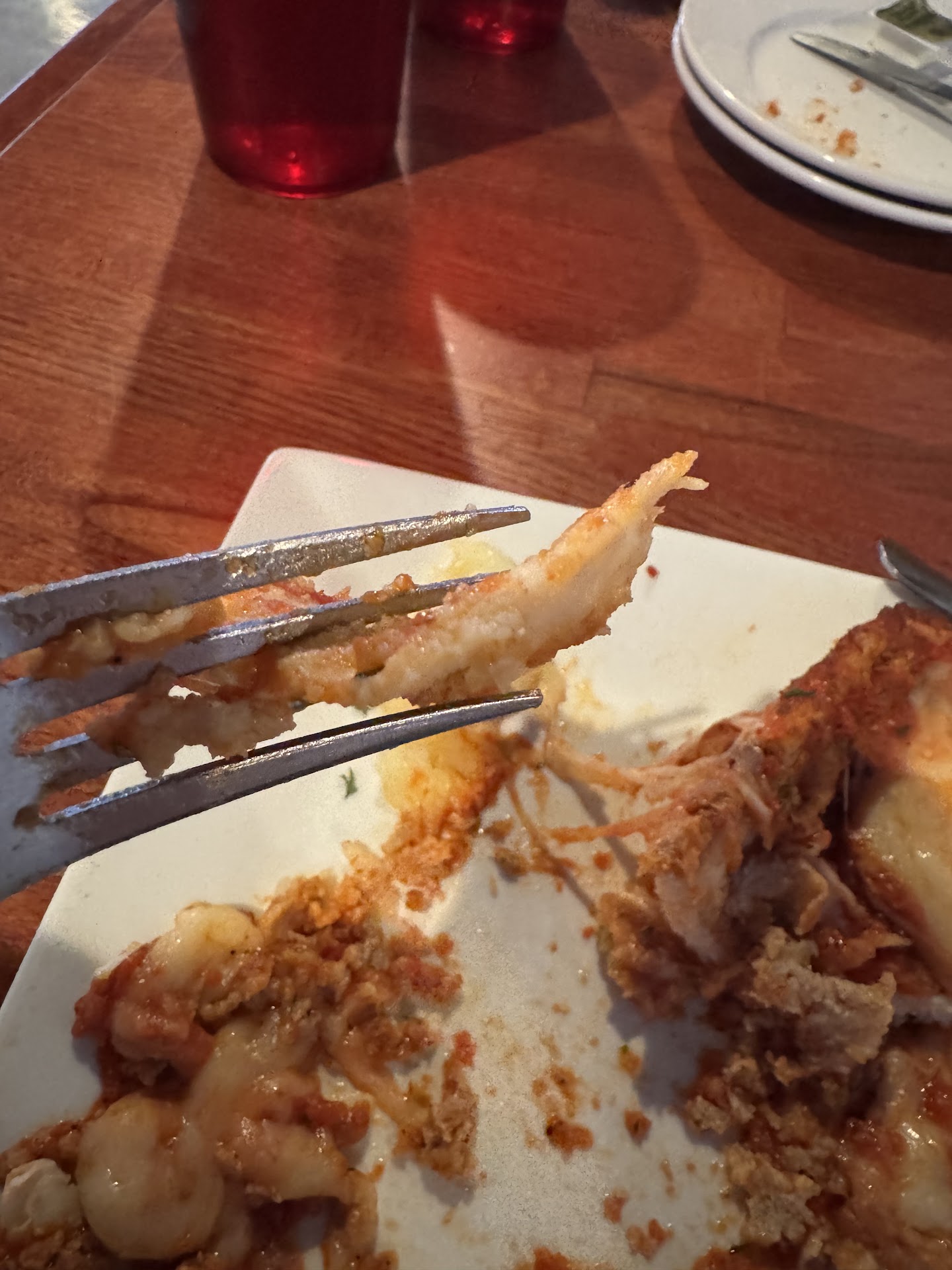 I put the rest in a box and brought it home. After airfrying the leftovers, the cheese got nice and melty but the dough is still gooey and I had to toss it out. The second pic is after air frying it at home. I pinched the dough to try and show the texture - that's not cheese.