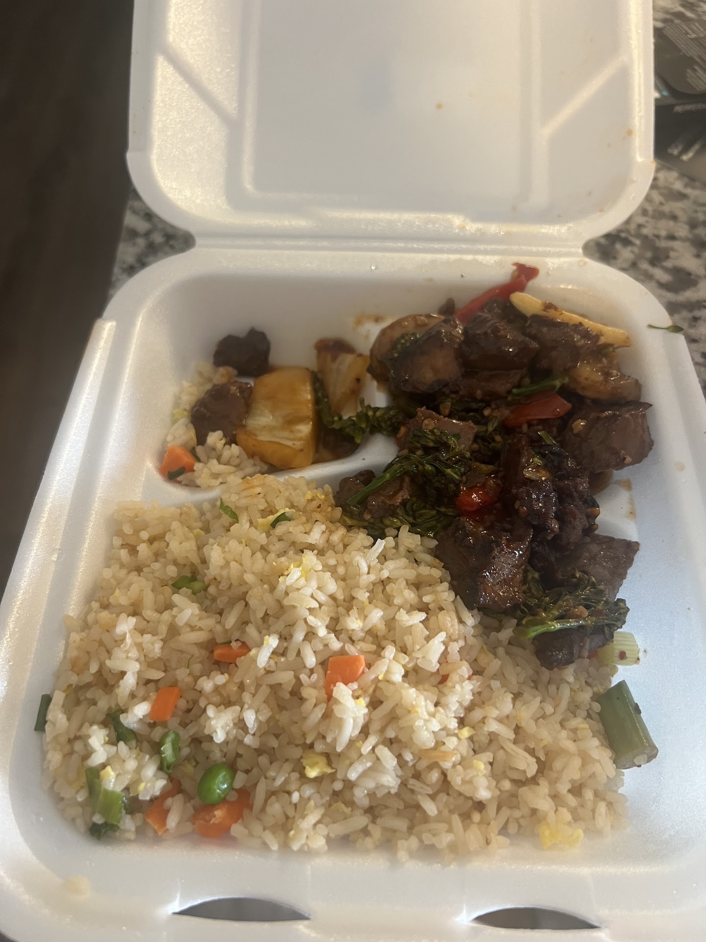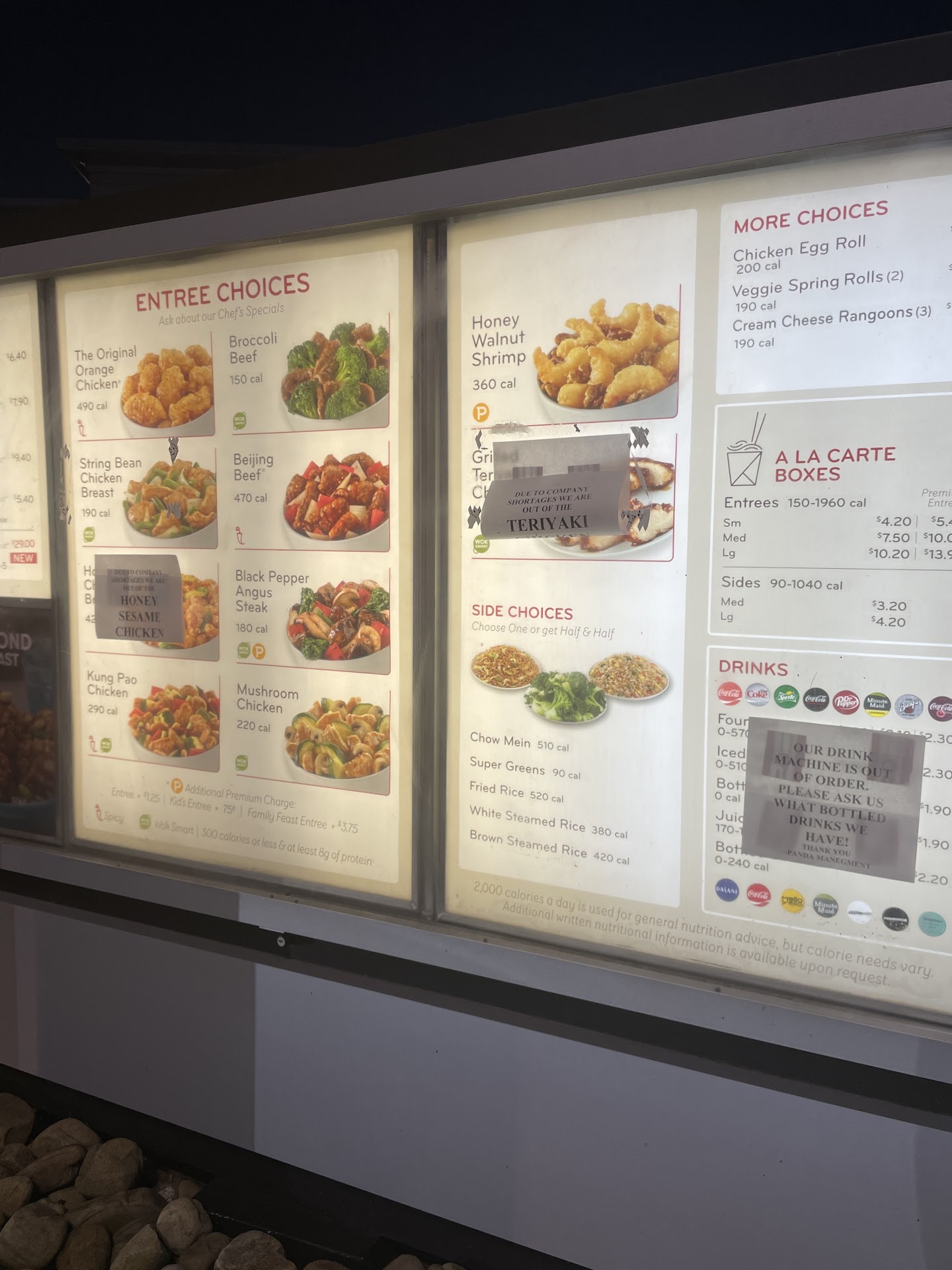 Everything on the inside is ridiculously sticky every time I go in. 9/10 times when I go to the drive thru they don't have what I ordered, but they don't tell me that until after I have paid. I always order veggie spring rolls and never get sweet and sour sauce (that comes with it) even when I specifically ask. Forks are a rarity for the drive thru staff. & my last straw with this place was recently when the lady at the drive thru spilled the pitcher of sweet and sour sauce all over and into my bag, then proceeded to hand it to me. It got sweet and sour sauce all over me and all in my car. My car had to be detailed and my seats shampooed. I called to let the manager know because things like that definitely cost them business. The person I spoke with was not the manager, didn't offer to leave a message, and would not tell me a good time to call back but insisted I tell her. She literally laughed and asked me what I wanted her to do about it. 🙄🤔 So, food is decent when they have what you want, but not worth having to clean your shoes or car after...