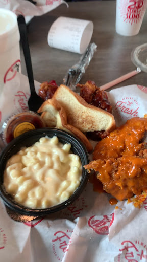 Ok soo we were dropping my God-daughter back off at College and before we left we wanted to have lunch with her before he class started. She suggested she knew a place that had (as she described) “the best chicken tenders and Lemonade” so we ended up at a place called “Slim Chicken”. There was 4 of us, to my knowledge all the meals come with 1side toast and a drink!!! soo #1 Slim’s meal (5pc tender w/fries toast and lemonade) #2 Buffalo Tender Mac bowl meal (toast & lemonade #3 Chick’s meal (3pc tender w/ fries toast and lemonade ) lastly #4 Classic meal (4 tenders (2tossed in buffalo sauce and 2tossed in honey bbq)w/ Mac & cheese toast and peach tea lemonade). For our sauce we had garlic parmesan, ranch, honey mustard and honey bbq. All the food was fresh and cooked to order.. we got our food so fast we were still ordering as they were bringing the 1st of our order!!! the chicken tender were seasoned and crispy. The breading was just right. The fries were hot and fresh. The side of Mac and cheese was bland, just noodles and cheese sauce. but the Buffalo tender Mac bowl was delicious. I believe it was the extra shredded cheese green onion mixed with the buffalo chicken that really took the boring basic Mac and cheese up a notch. The lemonade was the best I have ever tasted. Even better than Chick-fil-a!!! Not to mention they had both raspberry and peach tea that I mixed with the lemonade and that was delicious as well. The icing on the cake was the customer service!!! The restaurant was nice and clean. They cleaned behind every customer swiftly. I loved the ambiance. The cashier was really sweet and when I told her it was my 1st time the manager came out to greet us to make sure we received everything we needed!!! Which is a plus because customer service is rare these days!!! I really enjoyed the food and the ambiance!! I will...