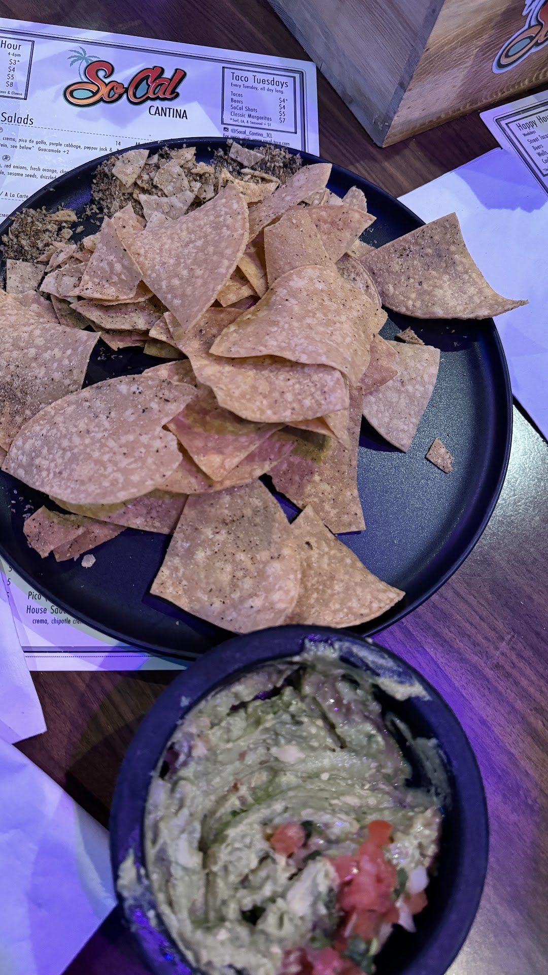 I went to SoCal last night with my girlfriend and I had high hopes because I had gone in for a drink one day and it was delicious. Well, I was severely let down. We were seated and had no time to look at the menu before being offered an appetizer to which we briefly looked and saw queso listed for $3.50 so we agreed (I will get back to this). The chips were fresh, but covered in seasoning that we had to tap off before dipping in the queso, which seemed to be a yellow cheddar nacho cheese sauce & not the traditional white queso you get elsewhere. The menu doesnât have much in my opinion so I opted for 3 tacos; the surf taco with no lettuce, the LA taco, & the Long Beach, all on corn tortillas. My girlfriend got the crunchwrap, no sour cream & added steak instead of ground beef with a side of rice. The tacos were presented on a plateâŚflatâŚlike no kind of restaurant presentation, but whatever that wasnât a big deal to me because Iâm not a fancy girl as long as the food and the price match. For $17.50 I got 3 tacos with no sides. Ummm that seems off, but again whatever. The Long Beach taco was really good, the flavors complimented one another very well and the amount of meat on the taco was great. The surf taco had one small singular piece of fried fish and pickled purple cabbage only, this one was mediocre. The LA taco is where I drew the line because there was hardly any meat. Now to the Crunchwrap, they got the order wrong and added sour cream the first time so we sent it back. The new one arrived with an abundance of black beans and a speckle of steak inside. The side of rice is NOT Spanish rice so please do not be fooled. We decided to box everything up and head home due to the disappointment. Once the check arrived we were confused about the $14 charge for queso (remember I said it was $3.50). We consulted with the server who flipped the menu over to show us that the appetizer is $14 & the side was $3.50, nobody told us that, but whatever yet again. All in all, the food was subpar, the service was subpar, the atmosphere was subpar. If youâre looking for a place to get a good drink during happy hour, then I would say this is a good spot, other than that youâre getting an overpriced and mediocre take on Mexican food. There are better Mexican places in the...