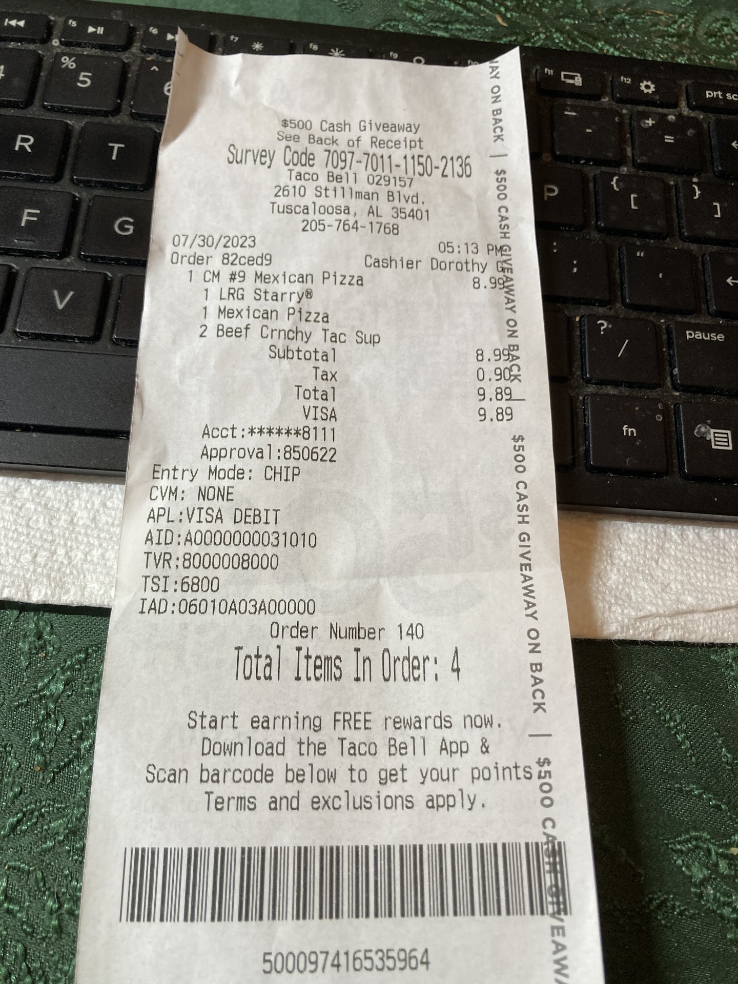 This experience was awesome! I saved the ticket to compliment. The food was prepared perfectly. The manager and Dorthy of this shift need promotions. They can make this store the best Taco Bell. This food reminded me of how it use to taste in 90's. I was a cook at Steakout and Wingzone. Steakout did well, but I've seen other cooks at Wingzone take shortcuts and their food reflected. A lot had to do with the management. I critique hard. Every once in a while, something will shock and amaze me. This was one of...
