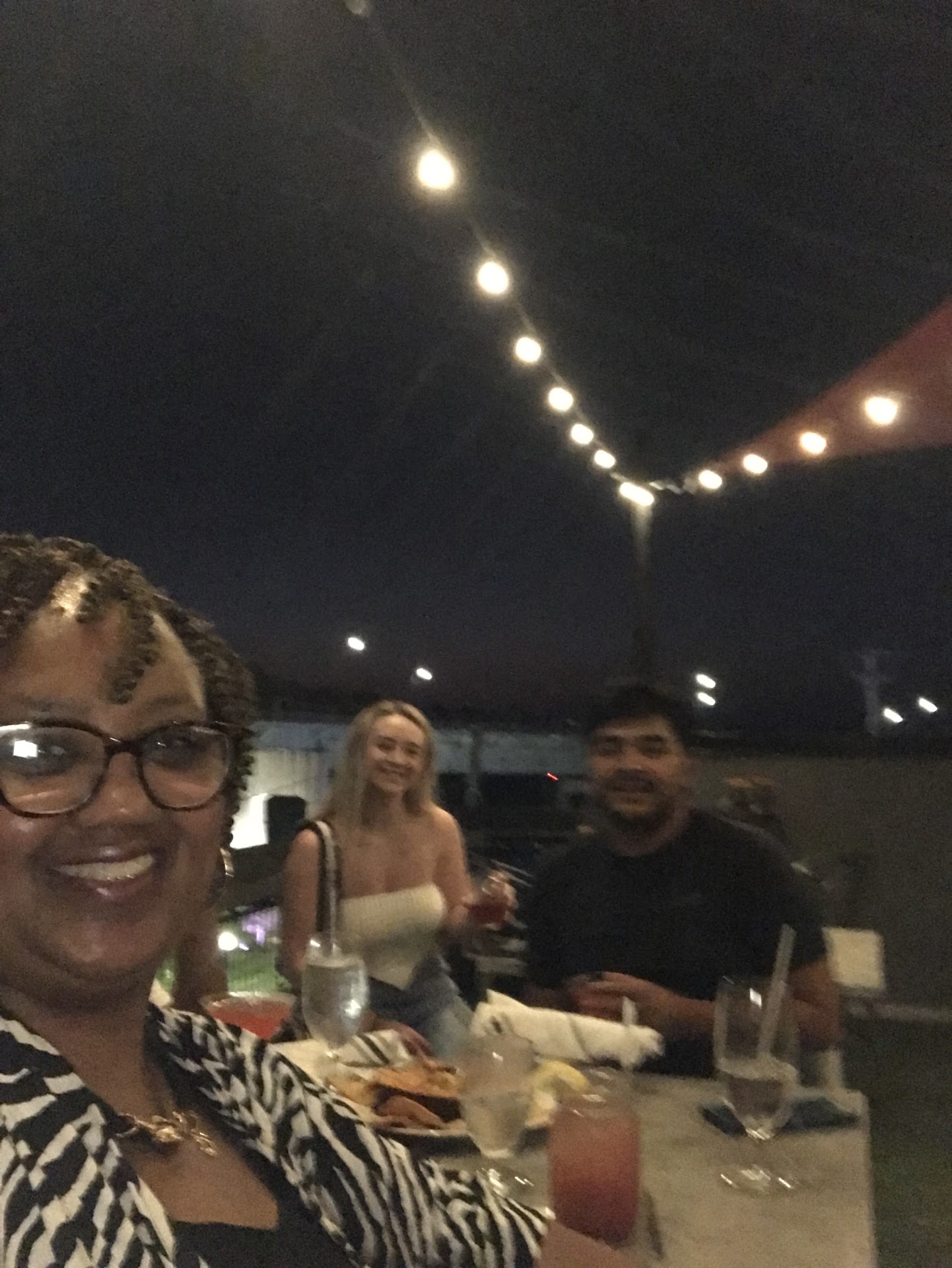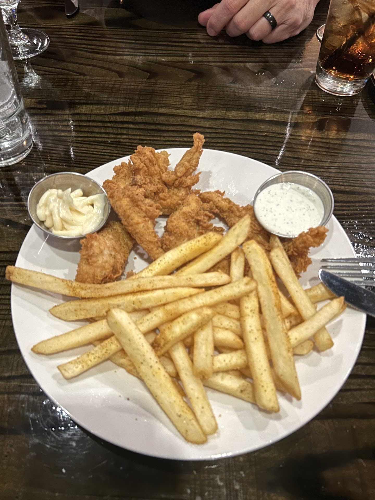 Located at the hotel Indigo by the riverfront . We came here to dine In . This hotel btw looks really cool too. We enjoyed the atmosphere and the rooftop seating with fire pit .Although a little too cold for me, we decided to dine inside. Blankets are available if you want to remain outside and enjoy the view. Inside there is a bar and very limited seating. The menu is small, the drink menu is not. There is a sign at the bar indicating that all drinks contain 1 1/4 oz of alcohol and if you want more or less you need to let the bar tender know. I ordered the chicken strips and fries, husband ordered the crawfish pasta and our co worker ordered the flat ironed steak and potatoes. Both my husband and I thought that the portions were on the small side. The steak was ordered medium rare and that is exactly how it arrived. Pasta was delicious, fries perfect and chicken done well. We cleaned our plates. Gin and tonic ($10) was weak . Our fault we didn’t see the sign...