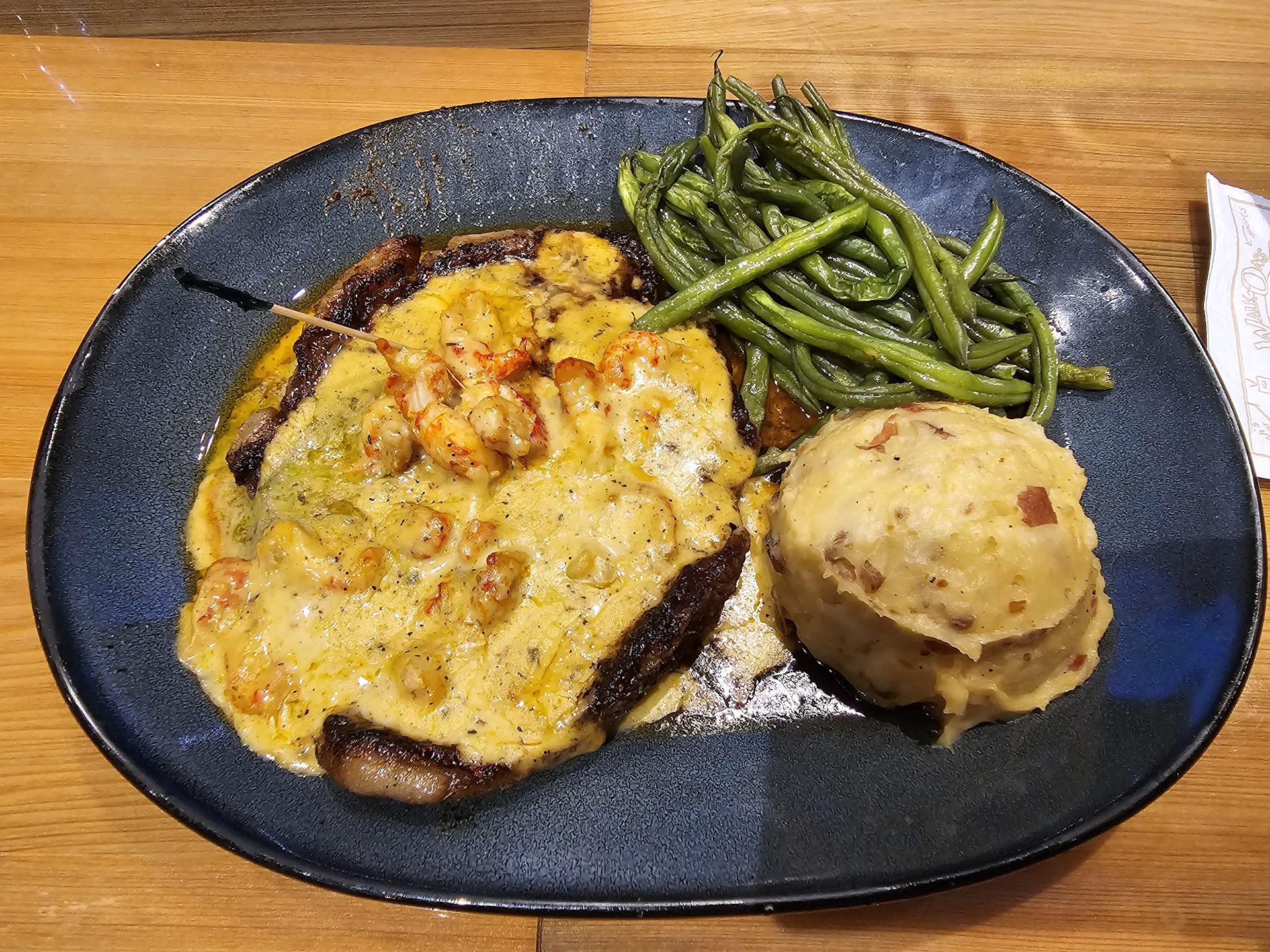 Unfortunately, our waiter Jeremy misunderstood the order and brought a whole ribeye steak with a side of what appeared to be two biscuits instead. My son, assuming that he was supposed to put the sandwich together himself, cut the steak to check if it was cooked correctly and to remove the excess fat from around the edges. He soon realized that the two biscuits that came with the meal were two scoops of mashed potatoes as a side order that he had never requested.