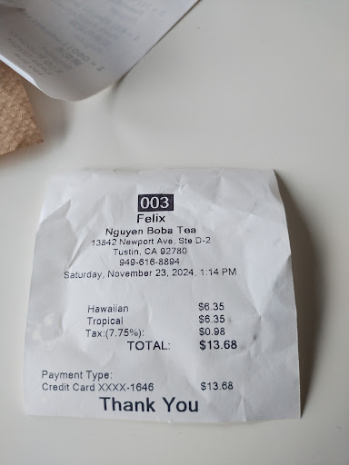 Read moreMy family and I went here and we ordered the Mango Milk Tea, Peach Smoothie, and Hawaiian Fruit Tea. Overall, I think the drinks were good, but this wouldn’t be one of my go-to boba places. The Mango Milk Tea was a little too sweet, and was ordered with half sweetness. I think there wasn’t a lot of mango flavor in the drink as well. The Peach Smoothie, I didn’t try, but my dad said it was too sweet and didn’t have a strong peach flavor. The Hawaiian Fruit Tea was refreshing and for anyone wondering, it’s grapefruit, orange, and pineapple (I’m pretty sure). So it tastes kind of like pog. All the greenery on the walls and everything made it very cute, clean, and modern. It would be a nice place to sit down for a while and hangout...