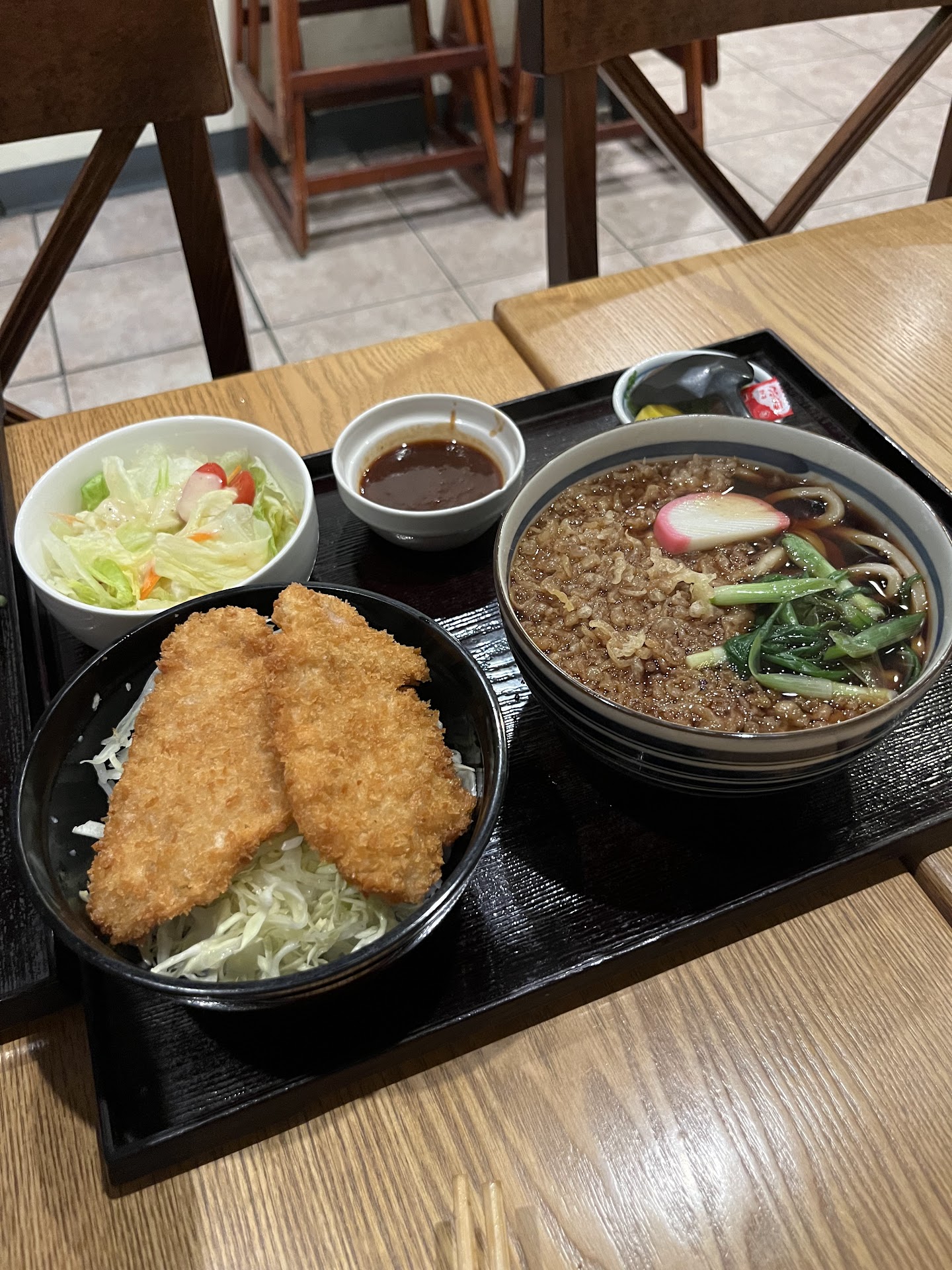When our food finally arrived after another hour of waiting, it was disappointing. The cold soba sampler was the best of the worst. The kashiwa soba was overly salty, and the kaarage soba was a major letdown. The chicken kaarage that came with it was dry, flavorless, and came without any sauce. Even the broth for the soba lacked flavor. We used a lot of pepper flakes, but even they lacked any kick.