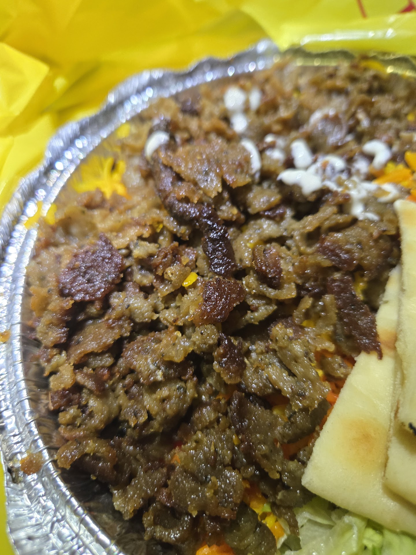 But, problem 2- TOO many corners are cut. The chicken is dry and tasteless. The beef (premade shwarma stacks) tastes industrial. I did not have falafel, so I donât know. But bread is terrible too, not the right bread for the food at all. Then, there is a sauce, referred to as âthe white sauceâ (!) which is the wrong sauce really. This needs a tahini-garlic sauce. Instead, you get a non-descript mayonnaise based sauce, and asked if you want suspiciously âpico de galloâ looking tomatoes and jalapeños on it (!). Saying no means you get some bad bread with dried out chicken on it, for a whole lot of money.