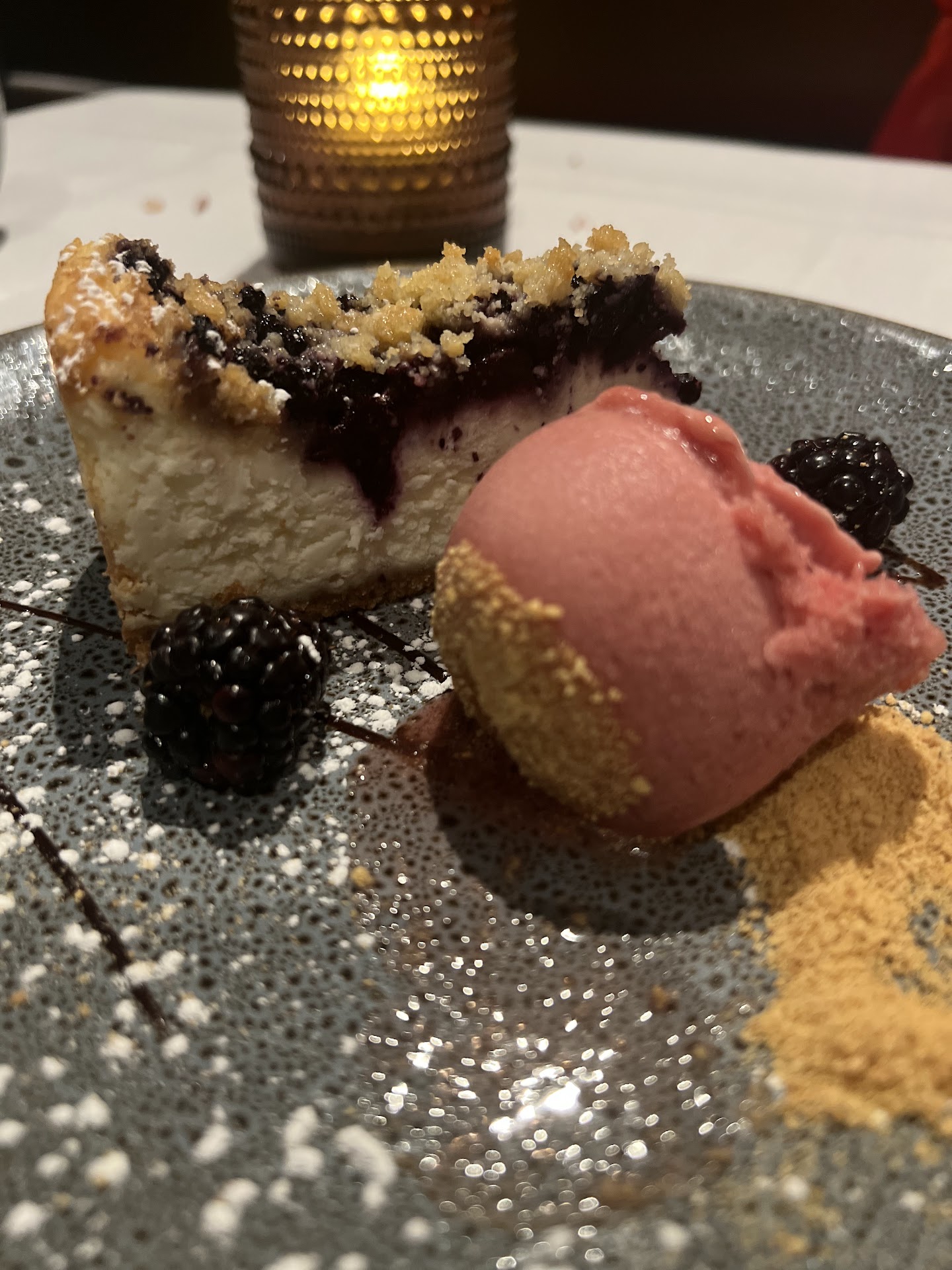 Sides and drinks were solid players in this uneven orchestra. The $15 broccoli, while comically overpriced, was well-prepared—vivid green and kissed with a touch of char. The sweet buds martini, a candy-like indulgence, contrasted sharply with the “Perfect Gentleman” bourbon Manhattan, a robust, smoky triumph of a cocktail. Later, the pineapple cider offered a pleasant, tangy nightcap. But for $76 a steak, is it too much to expect bread without having to ask halfway through the meal? Desert, an inspired lemon/blueberry cheesecake was one of the brighter spots here a solid choice, but like everything else just short of perfection.