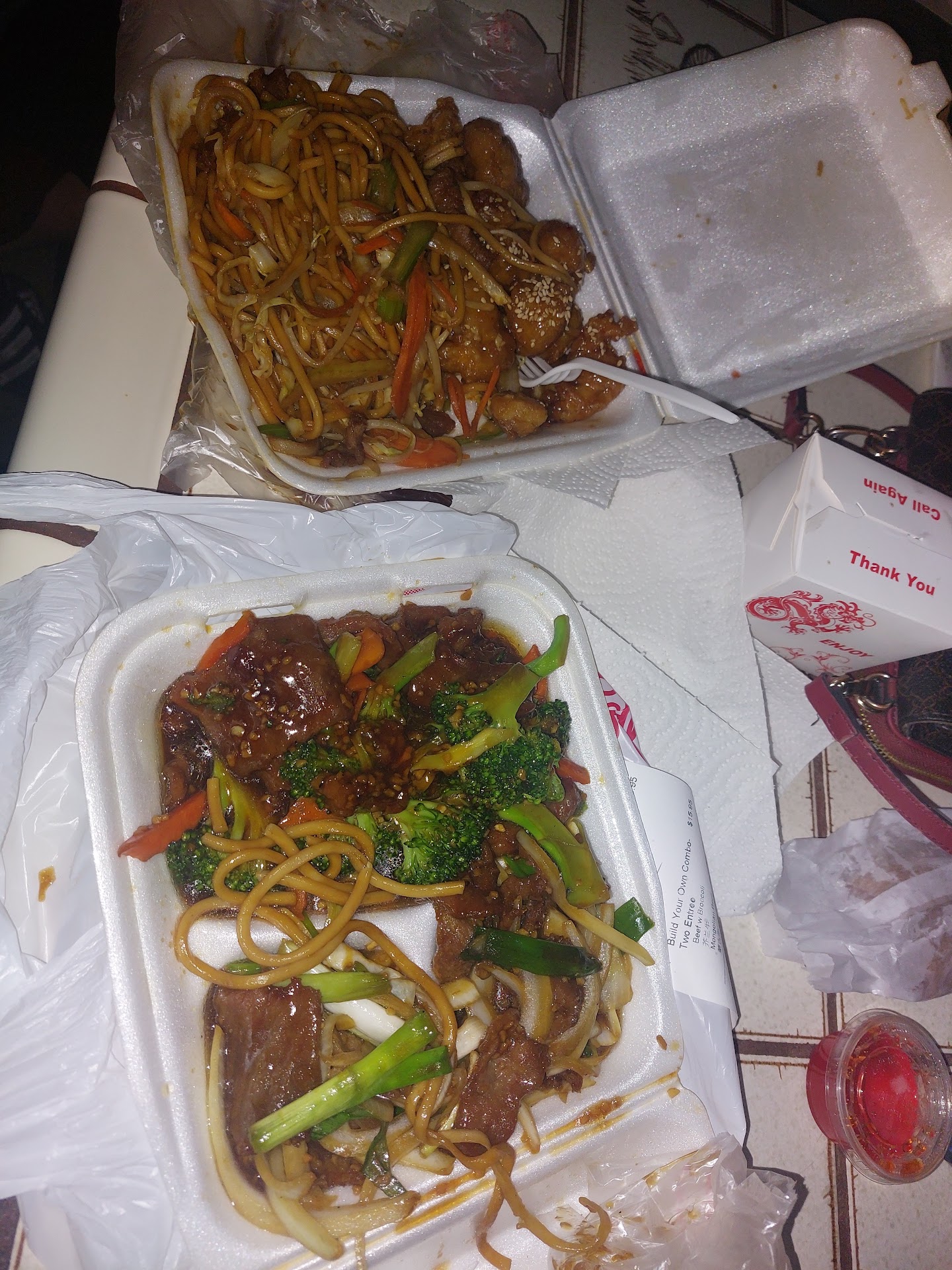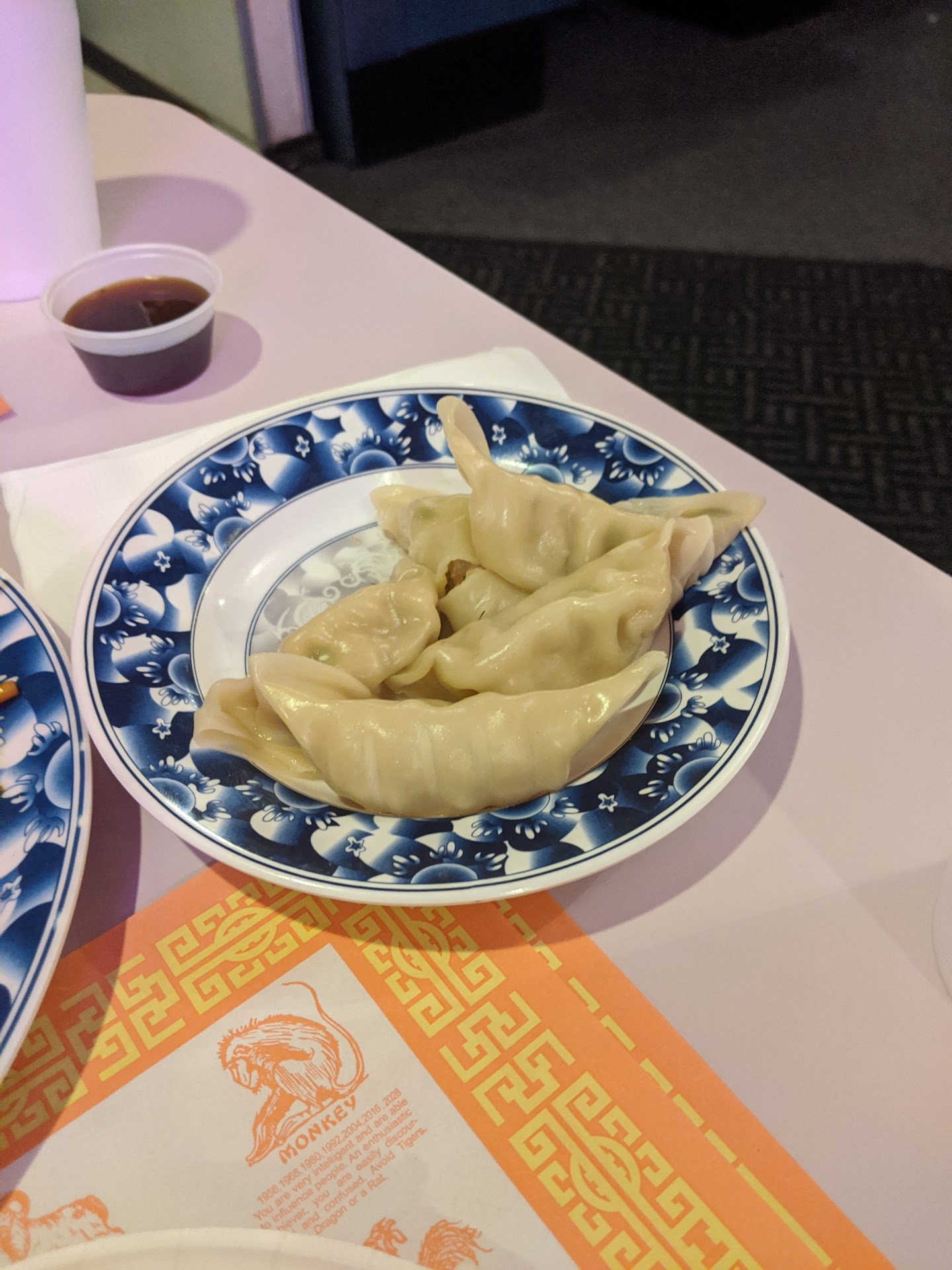 We ordered the garlic chicken, mixed lol mein and the pork dumplings. Food came out pretty quickly. However we ended up with some paper plates and plastic utensils to eat.