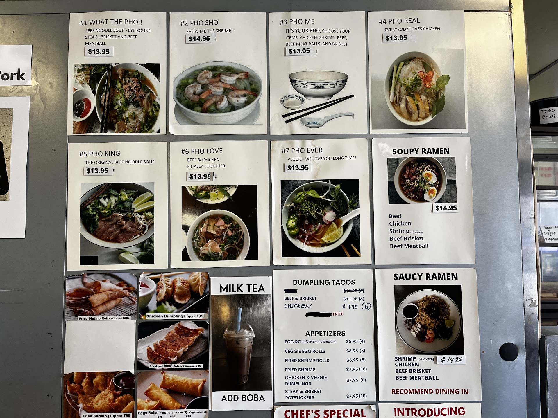 Read moreFun(ny) place with great food for what they serve. Converted gas station spot (years ago) that sells yummy fresh donuts in the morning (go there early, they only make a few trays each day and they may run out, though they seem to have this down to a science to meet demand). Other times, they sell Pho and ramen (and a few other signature dishes). Their Pho name menu is hilarious, like "Pho Love", "Pho Real", and "Pho King". I had the "What the Pho?" (special combo), which if you know how Pho should be pronounced in Vietnamese is kind of clever and funny. Regardless, Pho (confirmed with others in our dining party) was surprisingly good and authentic -- apparently the owner's mom/grandma's recipe. Never expected to have such good Pho in the middle of the desert! Highly recommend visiting for the good time and good food. There is little 'pretty' ambiance here--go for the food, nice service, and fun experience, not the 'ambiance" (not meant to be fine dining). Entrees were ~$16 at time of review. Not a huge seating area inside but plenty of seating in covered front patio (when it's not sweltering hot in...