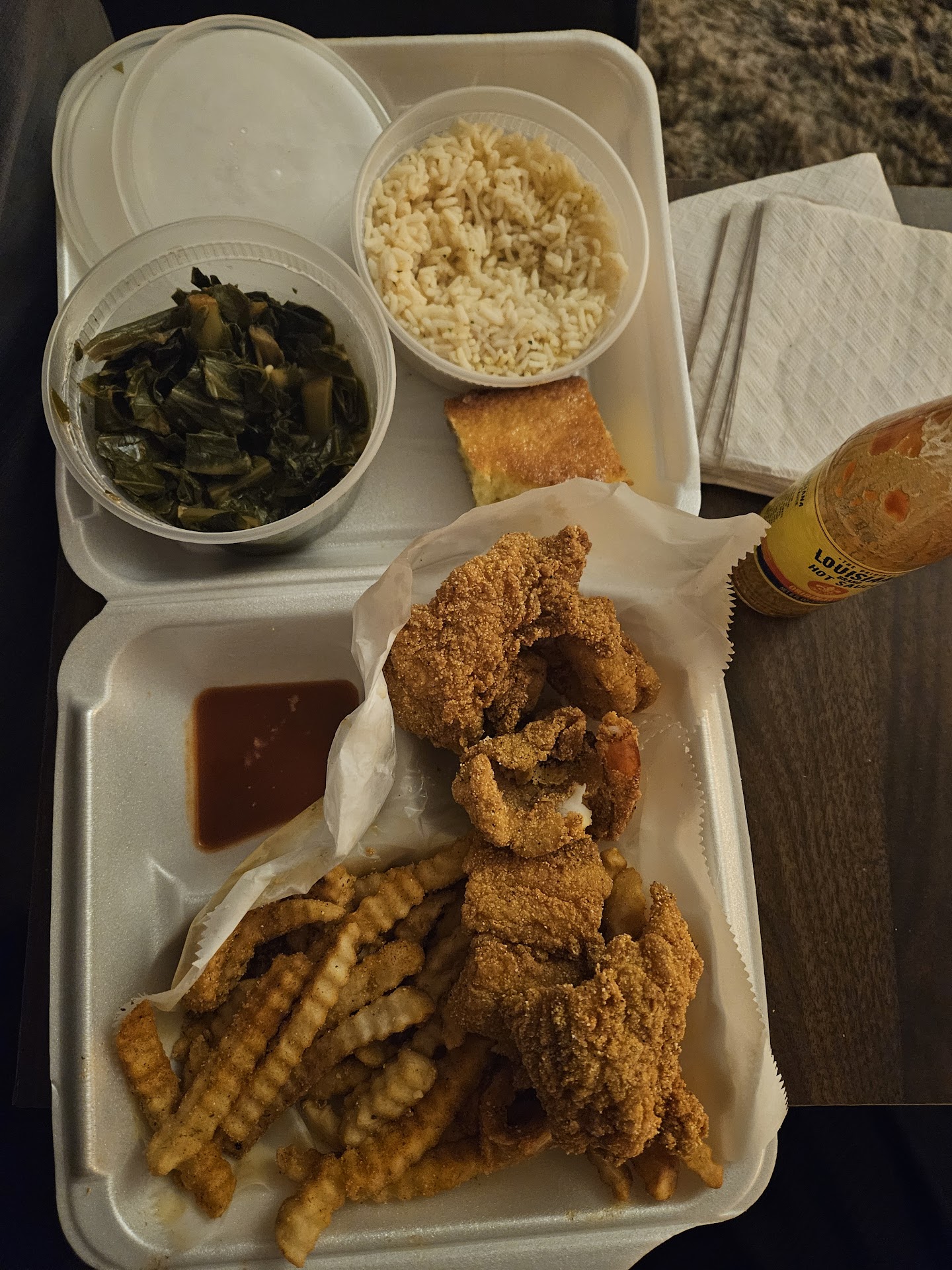Read moreVery bad food experience - never, ever order the gumbo! We both ordered the special for the night which was gumbo. Absolutely the worst gumbo we ever experienced. It was served in a small plastic bowl with a plastic top with the smallest plastic spoon ever, as if we were taking out and not dining in. There were about 5 chicken wings in the bowl and gobs and gobs of slimy chicken skin and fat. Absolutely disgusting! Only 3 tiny slices of sausage. And no shrimp or seafood. Very little rice. Having visited New Orleans and Louisiana many times, we know gumbo. Making the experience even worse was when we received the bill. They never mentioned price when ordering but charged us $28 apiece for a gumbo that had nothing but slimy chicken skin in it. Had it included the proper ingredients, one could possibly understand. But given that everything else on the menu was very reasonably priced to cheap, we assumed the gumbo would be also. And they charged us $1.50 more for drinks that the menu listed. However, best hush puppies ever! Avoid this place...