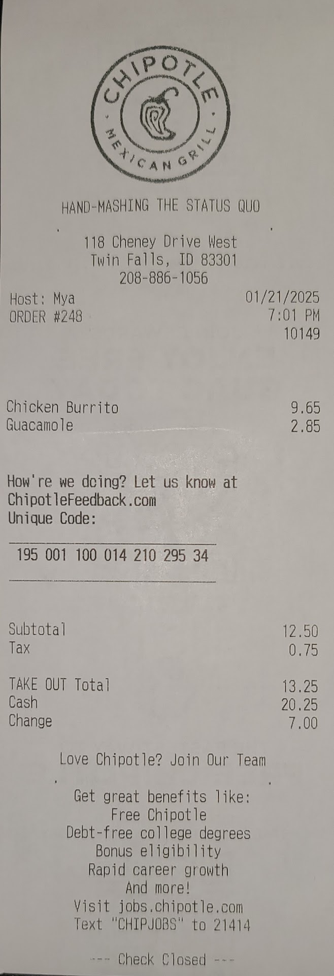 Read moreWAY TO GO TWIN FALLS!!! Screwed this one up again. It's true what the manager at the store said, "Chipotle is better near Military Posts." I was hopeful but the horrible experiences at the new TF Chipotle made a Cafe Rio customer out of me. I won't be going a 3rd time.
