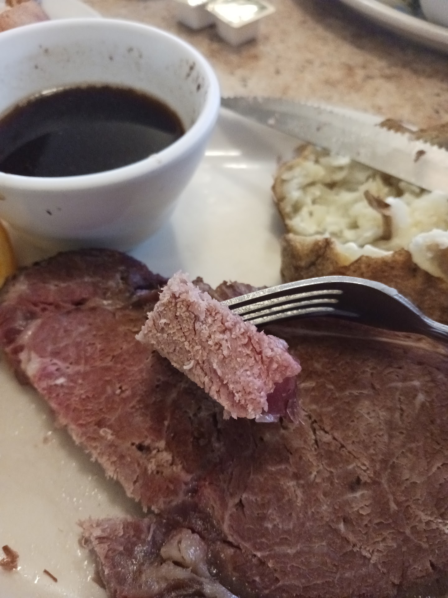 2 of us had a backed potato with the steak- You would think in Idaho you could get a decent potato. My wife's potato had black in the middle- It happens no big deal but it took nearly 30 minutes to get the potato (and her steak) back from kitchen. My potato was raw in the middle- Sent it back only to get another raw potato- again sent back and just got fries. but by then I had already eaten my steak (or rather choked it down because it was dry, tough and no flavor) - by then was past time to be back on the road as we had a 3 hour drive again of us.