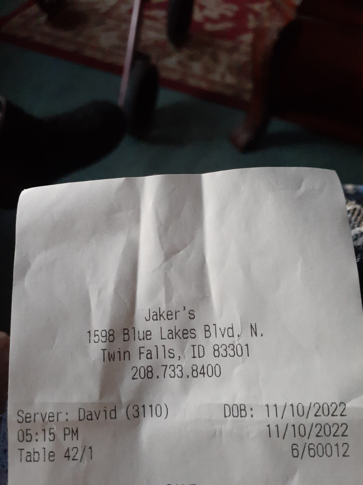 Ā Ā Ā Read moreWe had the chance to eat at Jakers while visiting Twin Falls. We are from Northern Utah so the drive wasn't all that bad. I am glad that we learned about Jakers while we were there but it wouldn't be worth the drive just for that. (There is a hidden gem in Montpellier that we happily drive to for food a couple times a year).