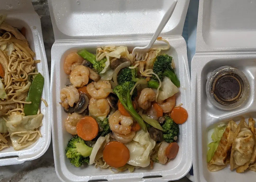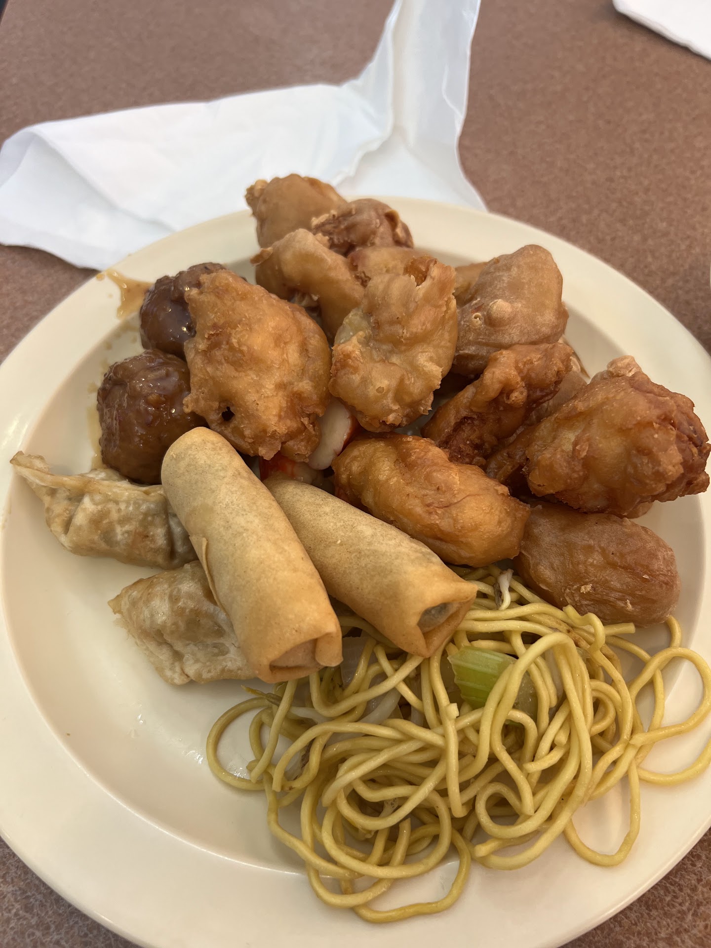 The lunch buffet is relatively small but it is only $10.00 in 2025 money. It had a salad bar on one island with: honeydew melon, cottage cheese, jello, pudding, potato salad, etc. Everything tasted fine. The entree island was not so good. The best five items were the BBQ meatballs, mashed potatoes, green beans, imitation crab meat stir fry, and fried shrimp and cocktail sauce. The sweet and sour pork and chicken, the noodles, and the fried rice were mediocre. The egg drop soup and chicken almond ding were not edible.