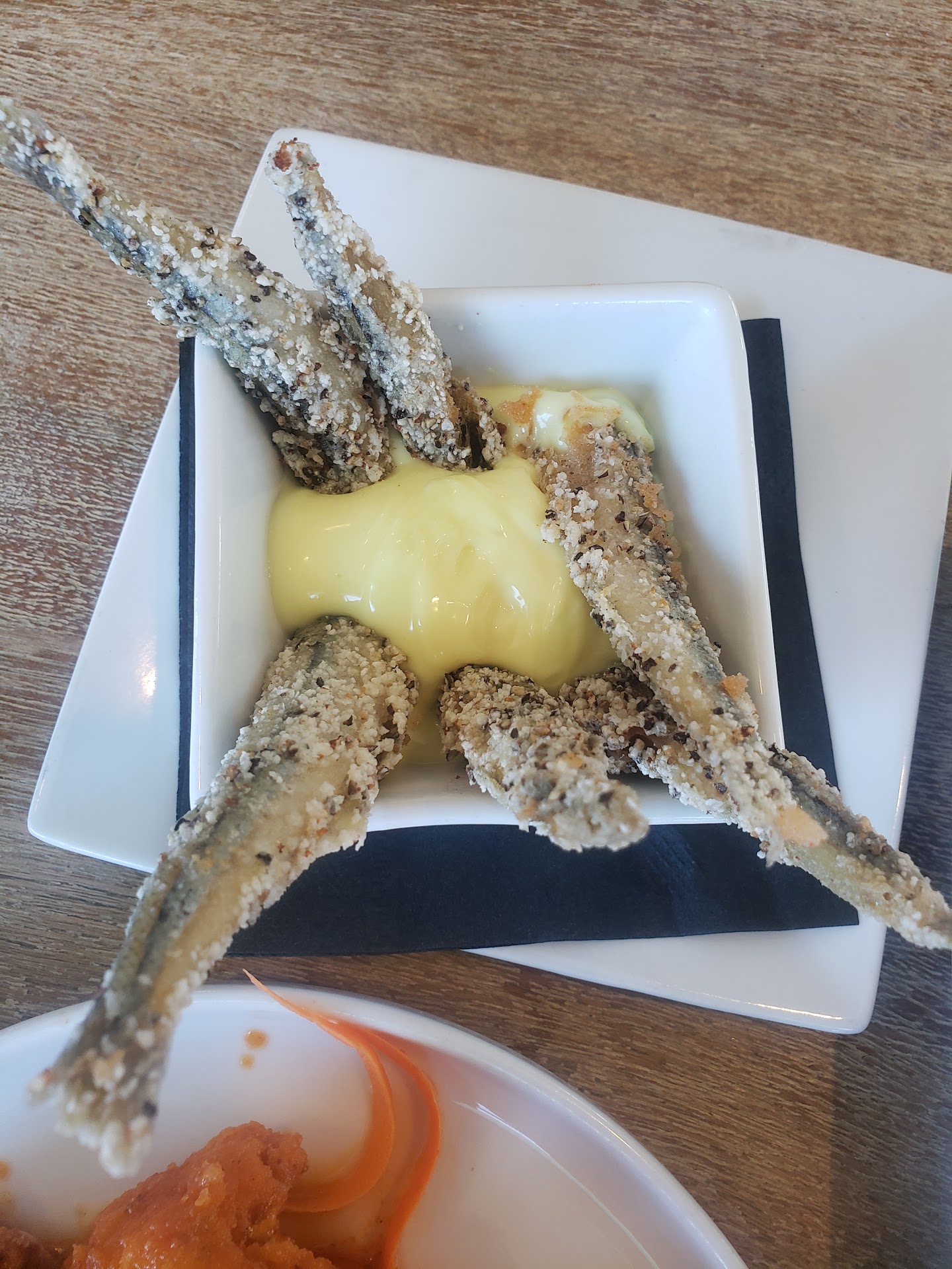 Read moreSo, based on the reviews and speaking with the hostess, we were looking forward to eating here. It was all of a 5 min drive from the North parking lot for Tybee Island. No reservation was needed and there was plenty seating avail. They had a drink special, Paloma for $5, so I tried it. Lets just say the only reason I finished it, was b/c I don't believe in alcohol abuse! The tequila was horrid and I understand grapefruit is tart- but good Goddess!! The kids ordered burgers and every single one was BURNT AND DRY! Apparently, a regular customer came in and EVERYONE working was so busy trying to crawl in her (rude) behind, they forgot they were actually cooking food for other customers. Dude buddy brought our bruschetta out (which was AMAZING) and we complimented the presentation - he had zero response. It was as though we didn't even speak. Our waitress, the chick, was good and very helpful. The buffalo cauliflower was also AMAZING - which is why we were taken aback when the main courses came and were mostly flavorless and dry! I added salt and pepper, but the curry was lackluster to say the least. The mahi sandwich was good, probably due to it being blackened and the fish and chips was also good - probably due to it being fried. The chicken and shrimp in the curry had zero flavor by itself and the pork rinds were BLAND AF! They looked well seasoned, but nope, we were fooled again! All in all, wouldn't recommend or make a return visit. Oh, and lets not forget the fly with maggots crawling out on the...