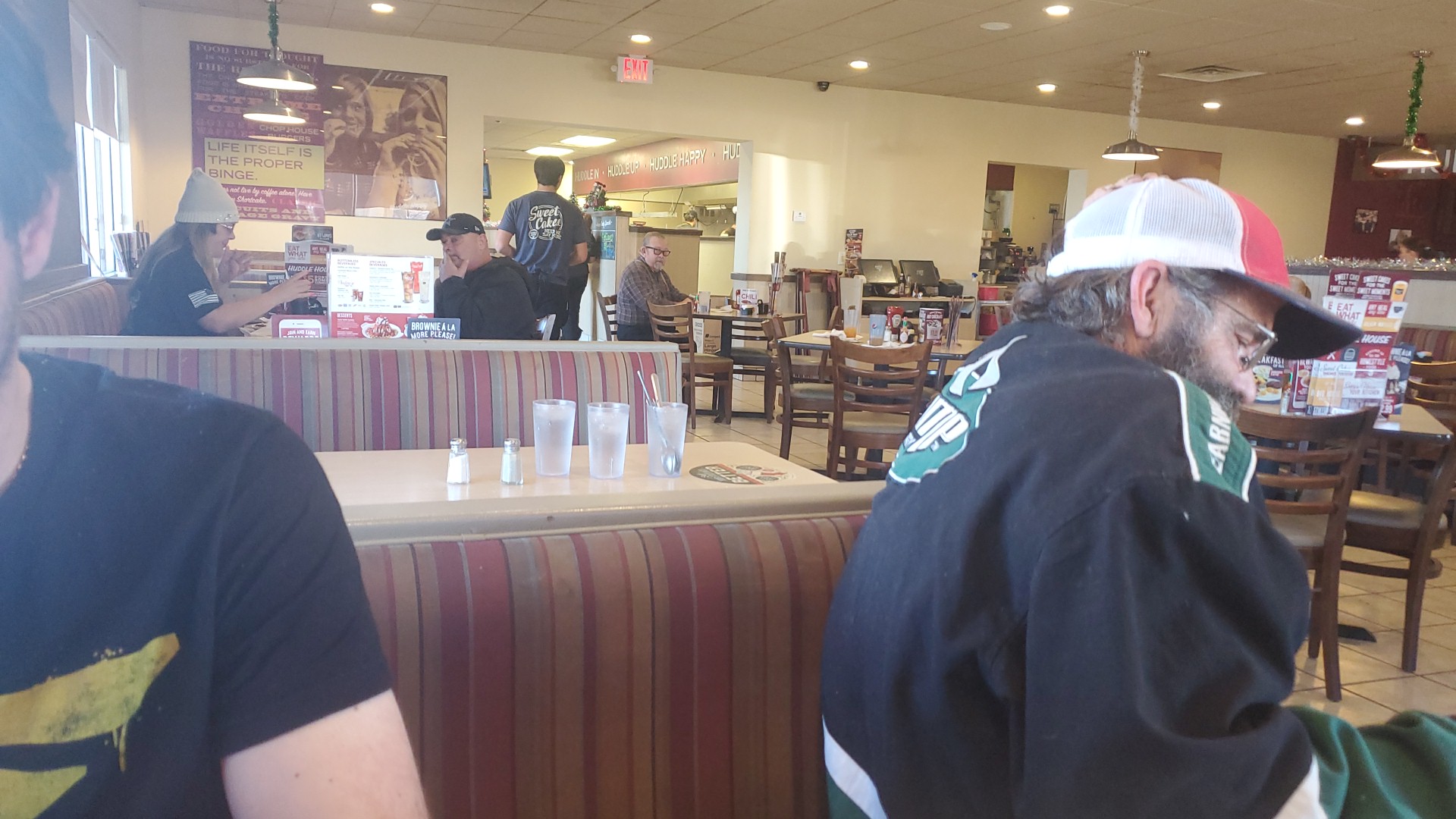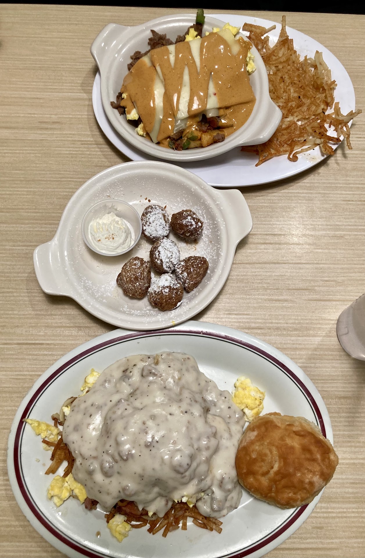 Read moreVery basic food. The place was completely empty at 3pm except us and 5 employees. You would think everything would be in order with the empty dinning room and abundant staff, sadly we were mistaken. Our waitress came to our table leaned against the bench and started massaging her ankles which was weird to see her rubbing all over herself before serving our food. We tried to brush it off and eat and get back on the road but the food took forever. When we got the syrup for our waffles and pancakes it had the consistency of water which I didn’t notice until it splashed onto my kids waffle along with water that poured out from under the cap of the dispenser. It seems as if the put the full syrup dispensers in the dishwasher and wipe them down and put them on tables because there was a bunch of stringy scraggly fibers coming off of the spout, it was a mess. I requested a different syrup and it wasn’t much better. My husband ordered a hash brown plate and when we got his plate it had 4 sandwich cheese slices on top, it looked plastic and unattractive. We didn’t finish our food and left unsatisfied and questioning what this world...