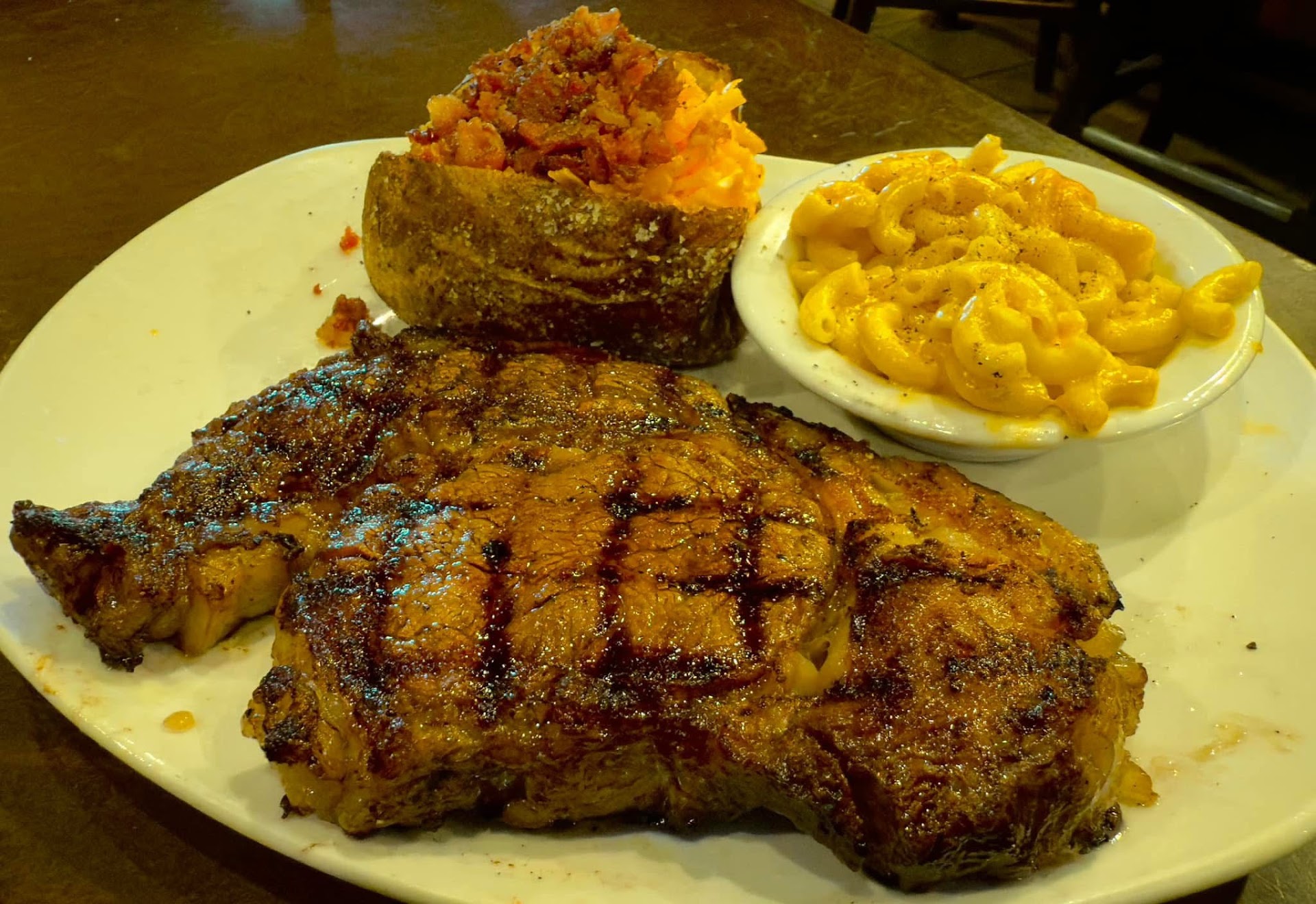 I ordered the 16oz grilled ribeye (medium rare) with the peppercorn cream sauce. For my 2 sides, I chose the loaded baked potato with a side of ranch and the mac and cheese.