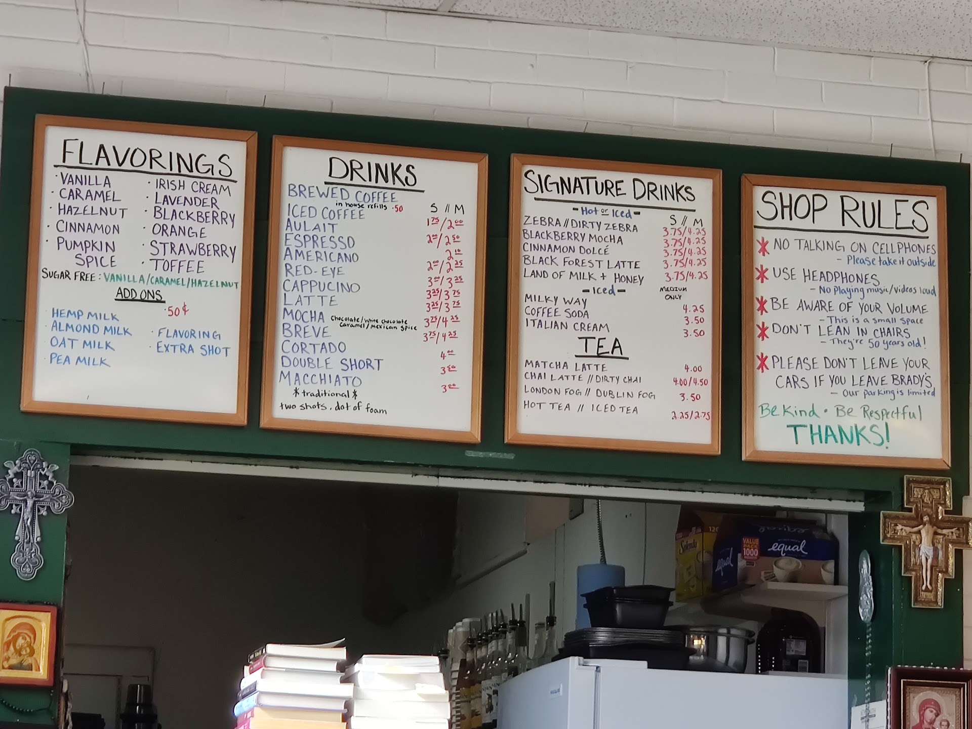 Read moreI went to Brady's yesterday for the first time. If you enjoy drip coffee with flavored creamers, this is the place for you. However, I ordered a latte with no flavoring expecting an espresso with steamed milk. What I received was a very watery coffee like fluid with a strong artificial flavoring reminiscent of the creamers added instead of milk. There weren't many customers in the place, so I am doubtful it was someone else's drink. I never saw or heard an espresso machine. I looked around waiting and saw several large glass containers with coffee beans in them. None had a date of roast. That large a volume in a small shop makes me think they have a lot of old and stale beans. If they genuinely thought they were selling me a good quality espresso, that is sad indeed. I hope they seek help and learn how to pull a good shot and the importance of fresh beans properly roasted. I have had espresso in many places across the planet. That cup was absolutely the worst I have ever had. If they are disingenuous and serving drip coffee and calling it espresso, that is shameful. I wish that they take the time and go have a quality espresso and learn what it is before serving more of what I was served. I would not wish...