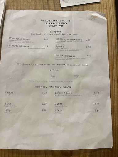 Read moreIn Tyler for work and Yelped a good burger joint. Burger Warehouse popped up and the name alone drew me in. When I first walked in, there weren’t many people and the interior was a bit different. Warehouse is an appropriate name. Lots of metal walls and tables and booths made out of old crates. Cool. But on to the food. Menu very strait forward - ice cream on one chalk board and burgers on the other. 6 burger choices, fries and a few add-ons. That’s it. I went with the southwest burger and FFs. I told the lady taking the order “extra crispy” and when she to the order to the kitchen, I heard her say “he wants the fries extra crispy. Food took a bit to be brought out - yes I didn’t have to go pick it up. So the FFs were perfectly done and crispy. So good. The burger, OMG was it good. So the one thing I didn’t like, and has nothing to do with the food is the table tops. I tried several and had the same results - the tops were sticky. Clean but sticky. Has to be from what ever was used to seal the wood. Hopefully...