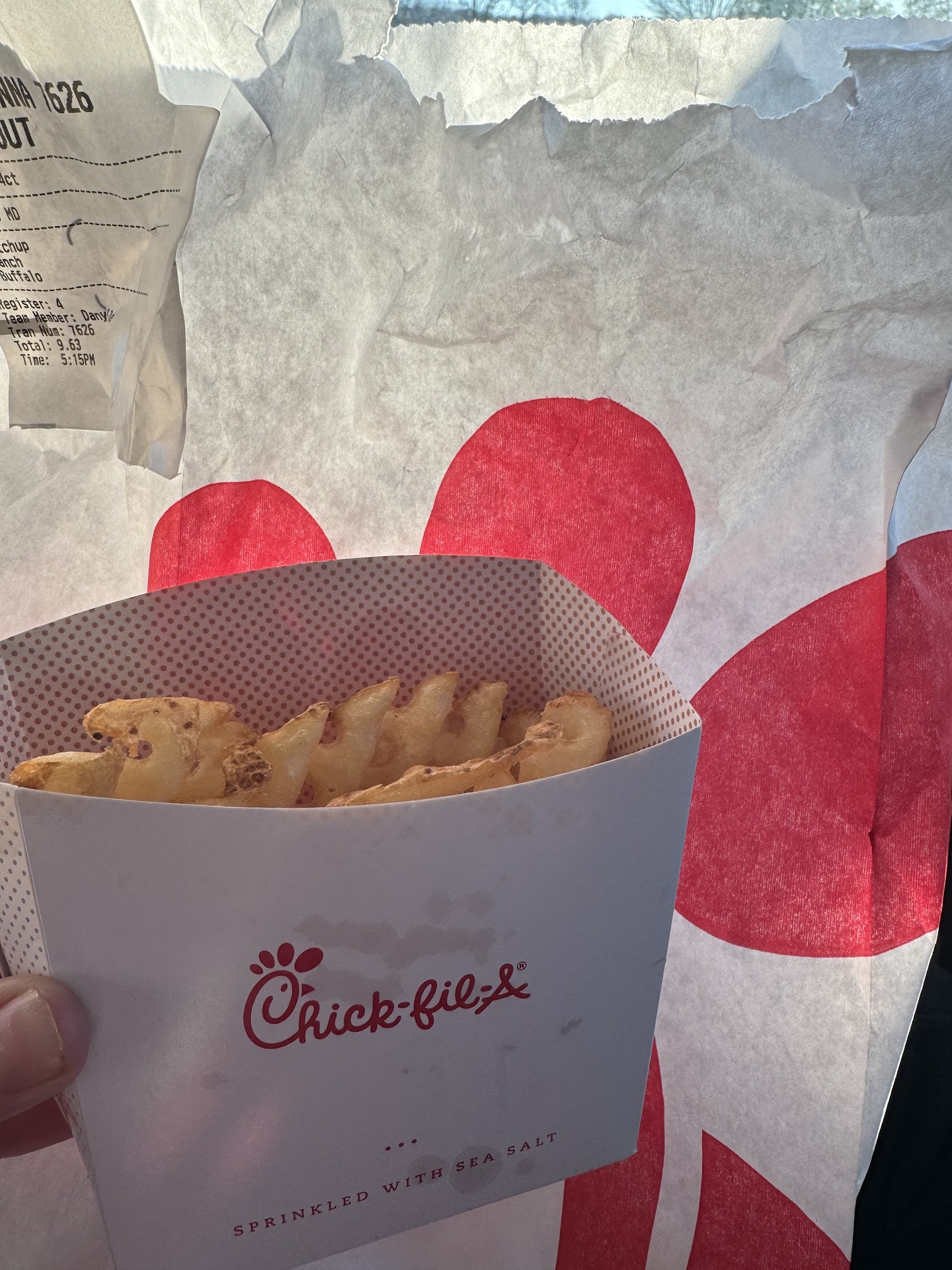 Greedy. The disparity between the ever-climbing prices and the amount and quality of food you get in this chain is no longer worth it. On a busy day out, I got my family’s food elsewhere but decided to treat myself a chicken strip meal for the first time in a very long time. It costs us close to $60 to eat there otherwise. We used to enjoy taking our children to eat at Chick Fil A; if there was one on a road trip, that’s where we would stop. If there was one shopping, that’s where we ate. Sometimes the chicken strips at Chick Fil A are barely larger than a nugget… you never know what you will get in the box. Lemonade is now a .33 upcharge in a combo meal. On my last visit to the Lindale location, the waffle fries in my $10 meal were loosely filled in so that there were huge air pockets in the fry box. When I took off the top fry, I was dismayed at how few fries I had been given. When I fit the fries in as shown in the photo (none had been eaten yet,) it was clear the box wasn’t even remotely full. I had maybe 6-7 fries in a medium I paid over $2 for. A man would have finished very hungry. We have been dealing with them squirreling away the ketchups and sauces behind the counter and making us wait and ask for more (and some locations like in Arlington even charge for more than 2 and that includes ketchup for your fries!) for a while. They also senselessly closed the playgrounds for over 2 years my children would go and beg to play on. I really may be done with Chick Fil A. I would rather feed my family quality food at home and pack lunches for on the go— and every now and then spring for a decent table service restaurant— than frequent a fast food restaurant trying to clean our pockets. At least Chick Fil A had helped me re-evaluate my priorities....