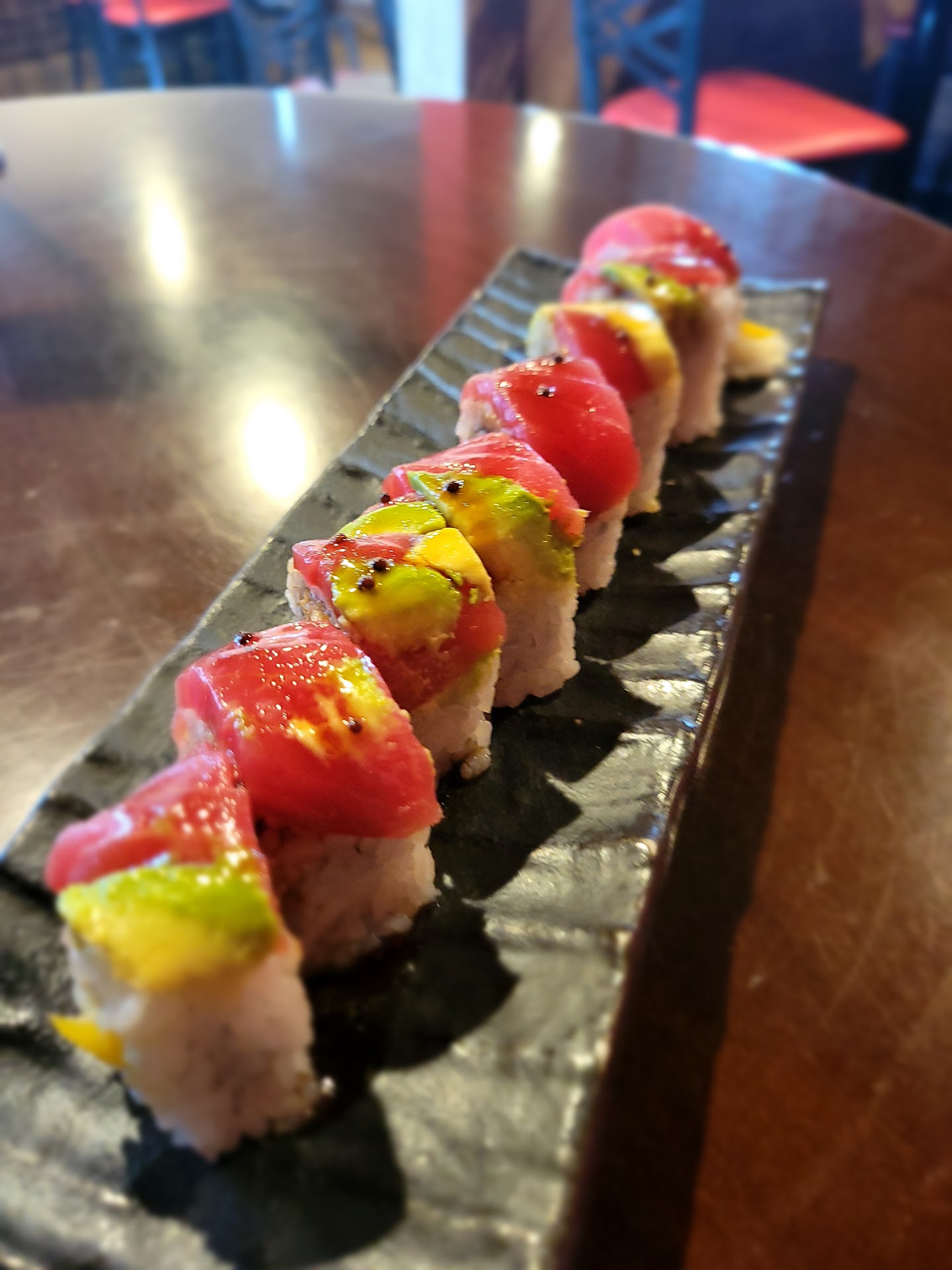 The food was very fresh, and well presented. I've had suspect sushi before--when that fish starts getting a little older, it starts smelling and tasting fishier. And I am sure to get the tummy rumbles later. None of that was evident here! Everything was very clean tasting. I ordered the Crazy Tuna (spicy tuna, mango and panko inside, sliced tuna and avocado outside), the AAC (avocado, asparagus, cucumber), the Unagi roll (eel) and some fried gyoza (dumplings).